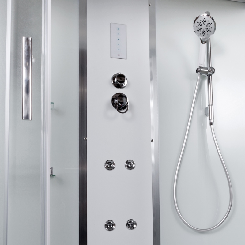 Стильная душевая кабина AvaCan EM4516 LED с гидромассажем сочетает в себе высокую функциональность, практичность и надежность. Для изготовления применяют безопасное закаленное стекло толщиной 5 мм, надежно фиксируемое алюминиевым профилем. Цвет профиля хром. В комплекте зеркало, донный клапан (клик-клак), душевой гарнитур, полочки, гидромассажные форсунки, тропический (верхний) душ.