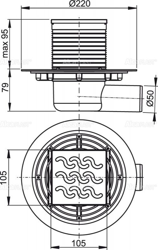 СЛИВНОЙ ТРАП 105×105/50 ММ БОКОВОЙ СТОК, РЕШЕТКА ИЗ НЕРЖАВЕЮЩЕЙ СТАЛИ, ГИДРОЗАТВОР – МОКРЫЙ