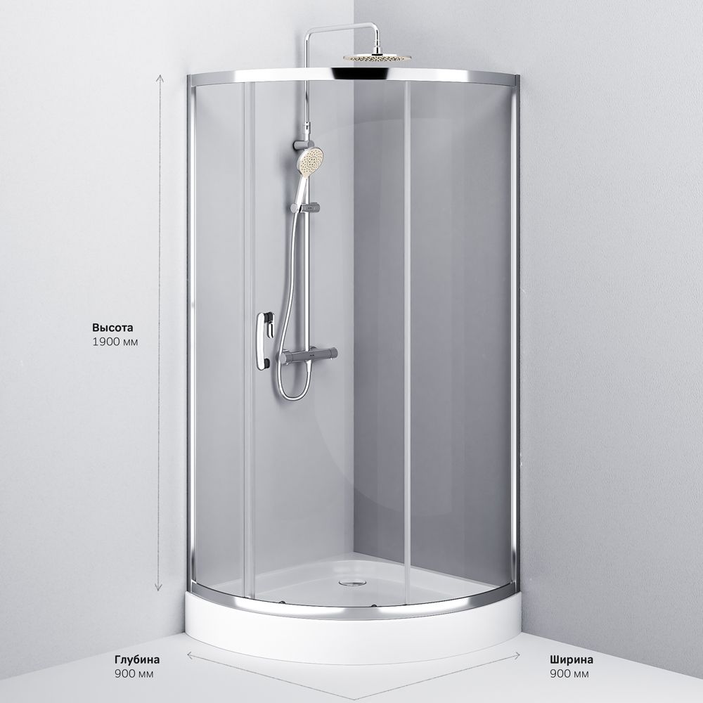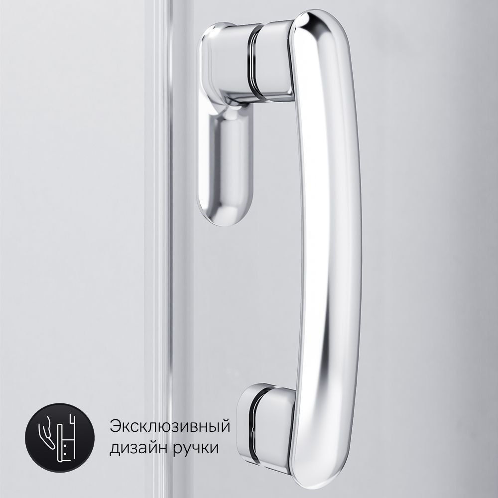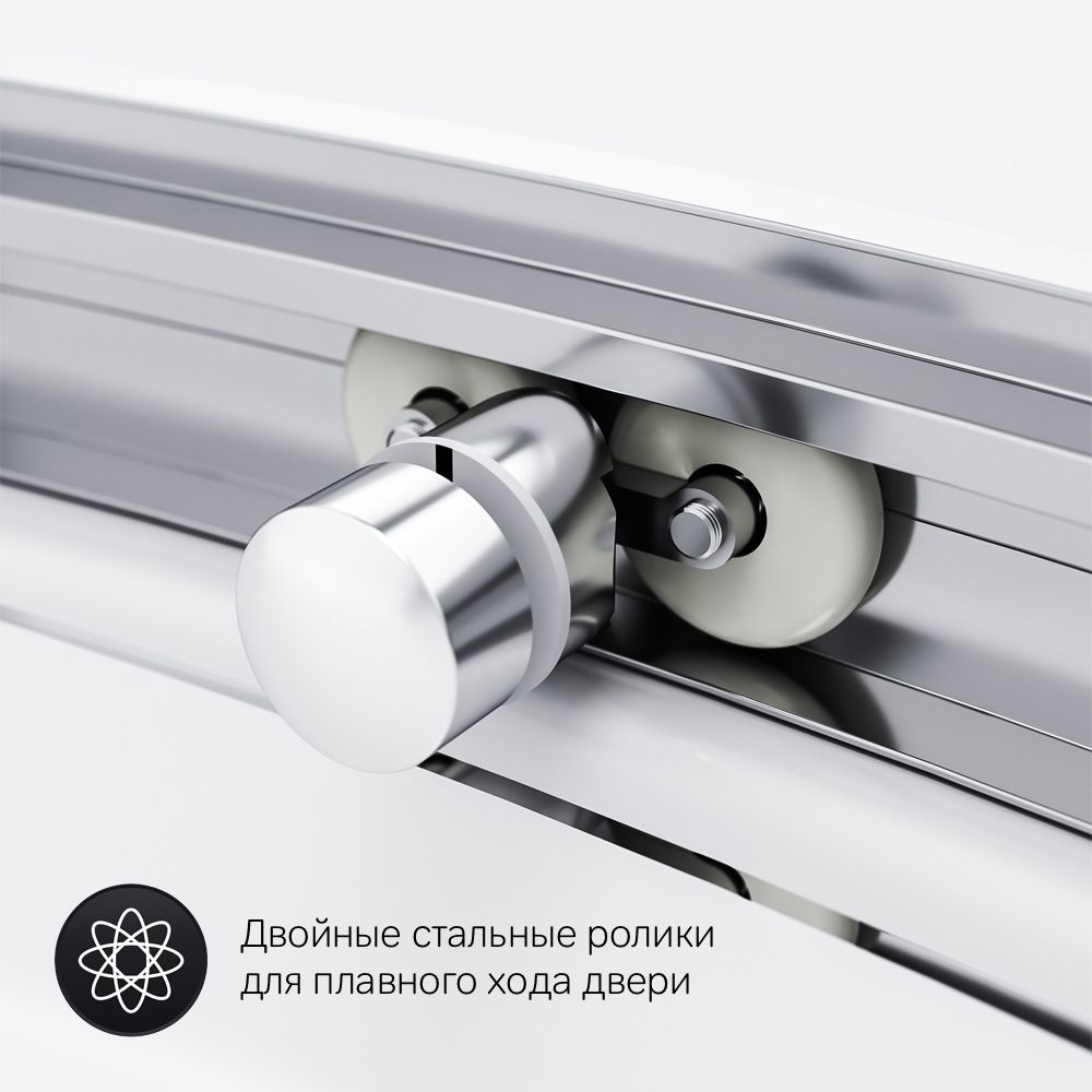 Внутреннее пространство на 15% больше чем у стандартных моделей. Увеличенный вход и внушительная высота профиля 1900 мм – с заботой о людях с высоким ростом. Двойные стальные ролики на металлоподшипнике обеспечивают надежность и плавный ход двери. Профиль хром глянцевый стекло прозрачное.