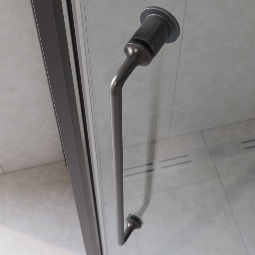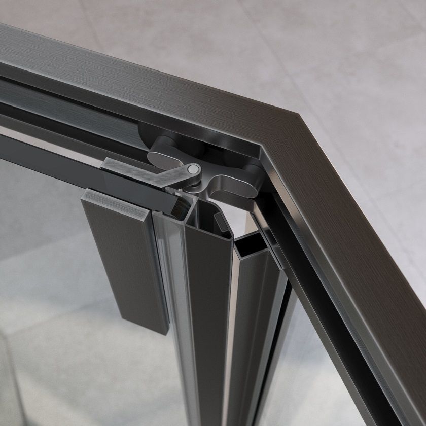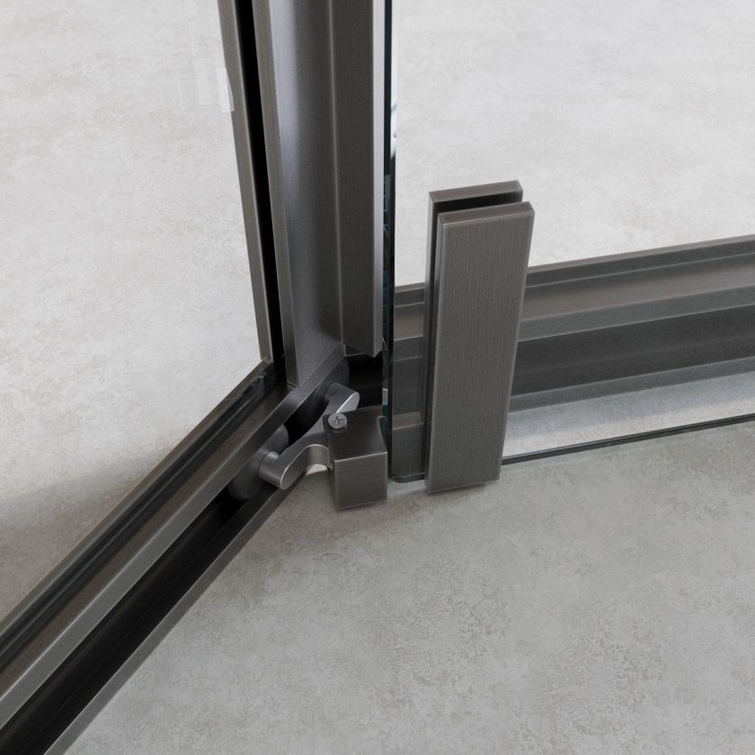 Раздвижная и распашная система открывания дверей с корпусом из нержавеющей стали и стеклом 8 мм, в трёх цветах (глянцевый хром, брашированное золото, оружейная сталь).