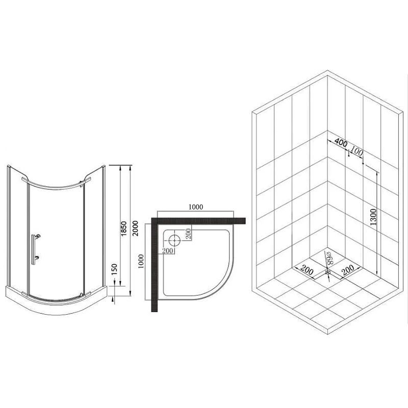 Уголок душевой. Низкий поддон (белый); сифон с гидрозатвором; алюминиевый профиль, цвет: "чёрный матовый", стекло толщиной 6 мм, прозрачное, двойные верхние ролики, регулировочный пристенный профиль 25мм. Распашная дверь на петлях. Стальная ручка, цвет "чёрный матовый".