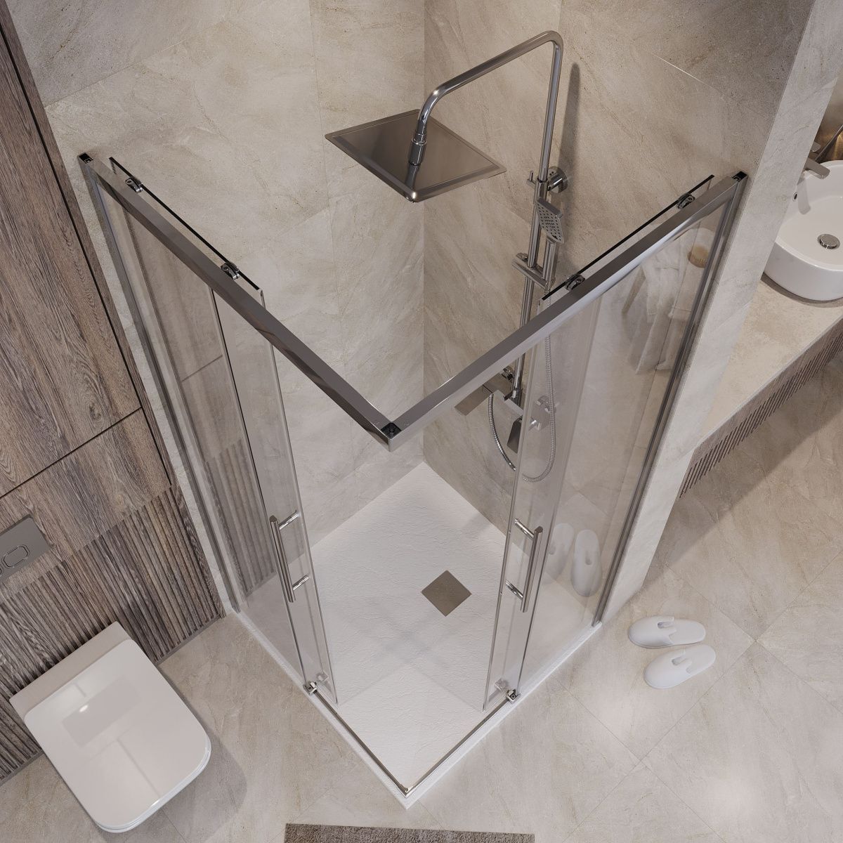 Преимуществом данного ограждения является быстрая сборка. Кроме того, пластиковые ограничители дверей легко извлекаются из профиля для удобства уборки, так как не крепятся винтами. Душевое огаждение может устанавливаться как на поддон, так и на плитку.
