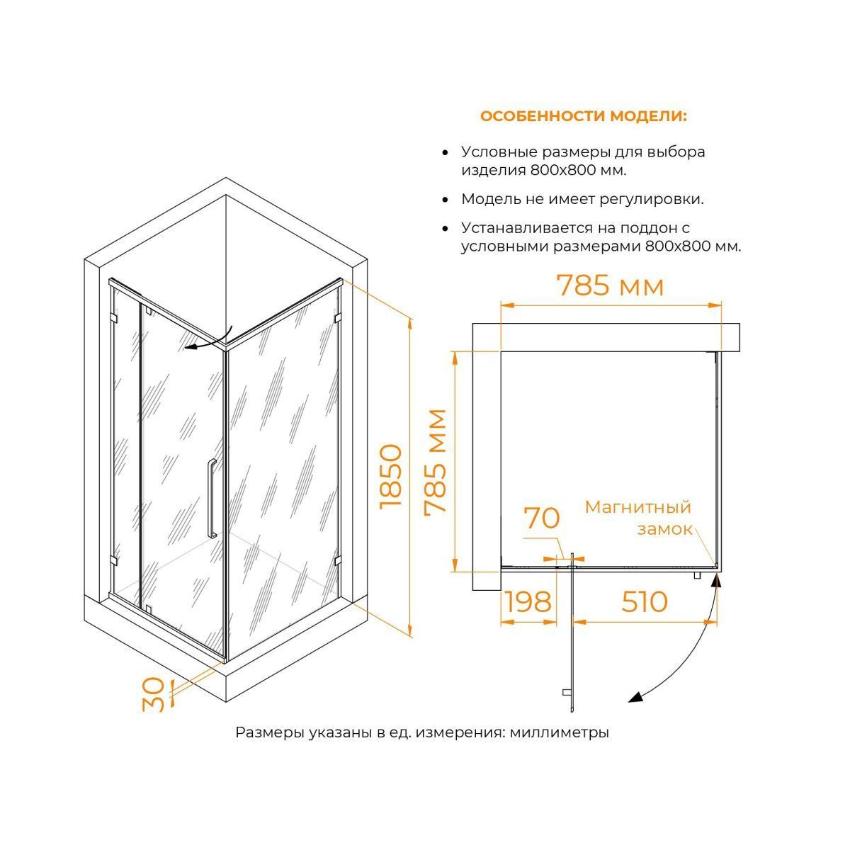 Модель представлена в чёрном исполнении профиля и фурнитуры, также обратите внимания, все уплотнители выполнены так же в чёрном цвете, что подчёркивает сдержанную стилистику душевых углов.