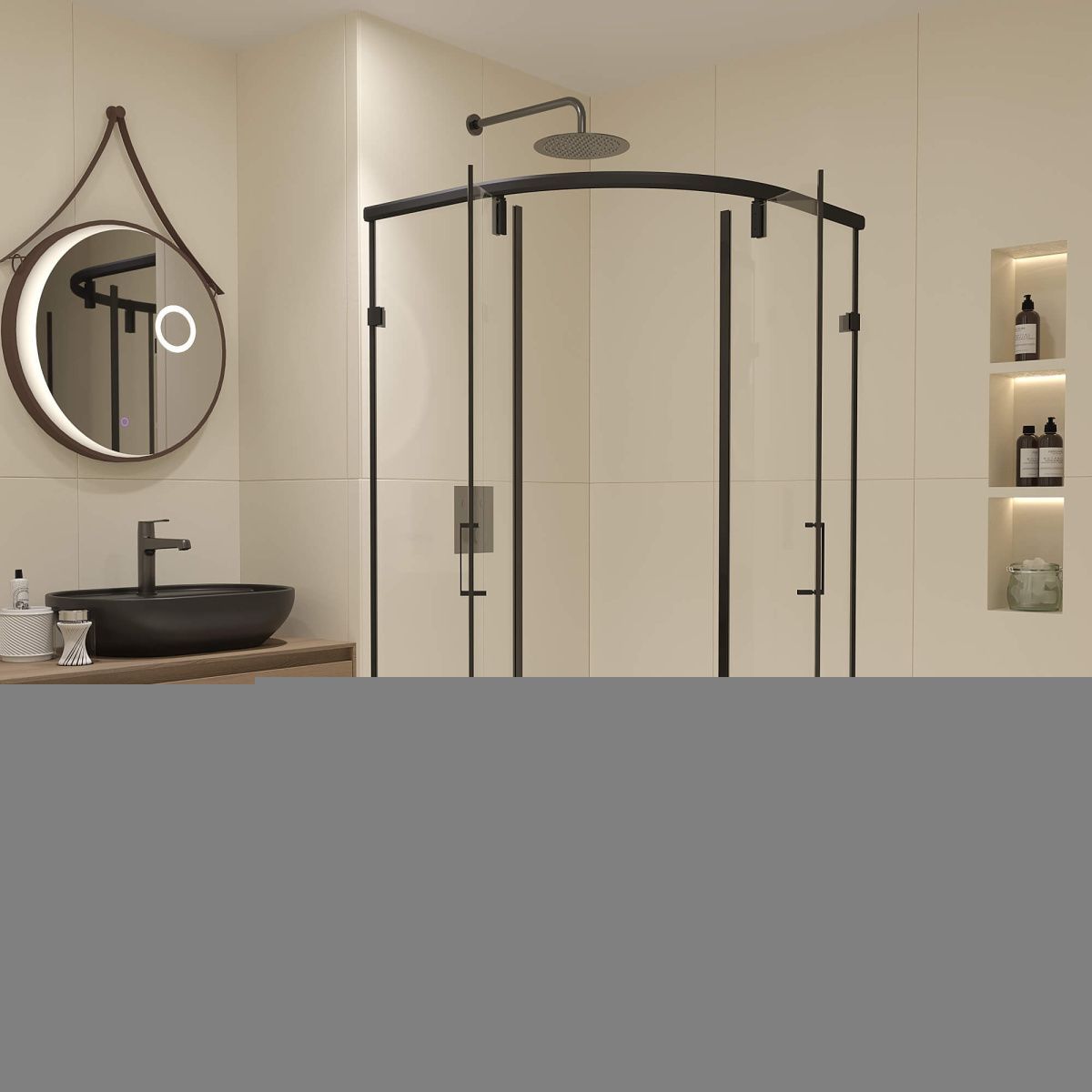 Модель представлена в чёрном исполнении профиля и фурнитуры, также обратите внимания, все уплотнители выполнены так же в чёрном цвете, что подчёркивает сдержанную стилистику душевых углов.