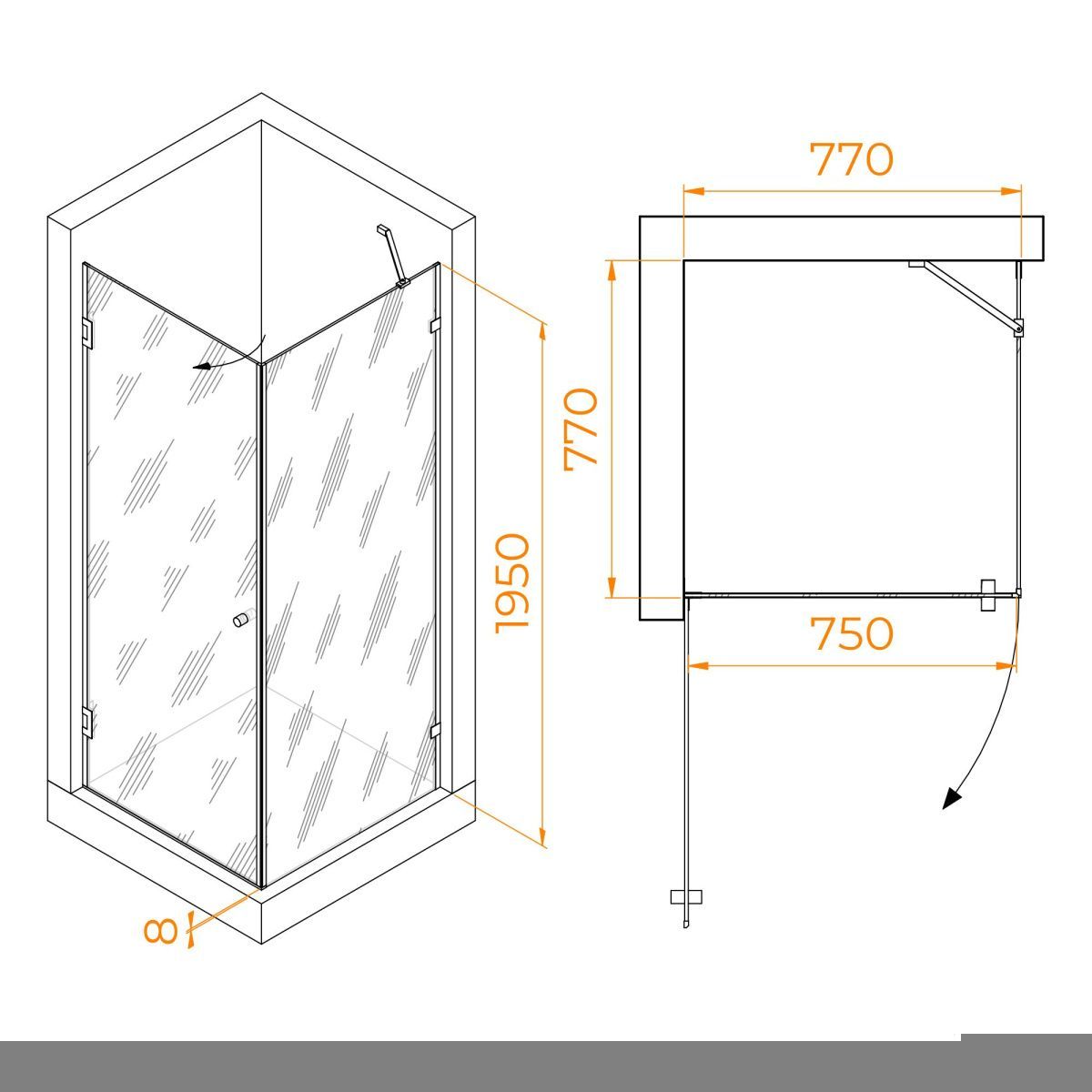 Конструкция душевого уголка квадратная, что позволяет его использовать в комнатах с различными метражами. Высота душевого угла составляет 1950 мм и отвечает современным требованиям к оборудованию ванной комнаты.
