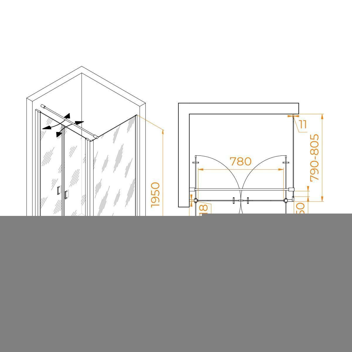 Высота душевого угла составляет 1950 мм, что делает его идеальным выбором для разных типов помещений. Независимо от высоты потолка, этот душевой угол легко вписывается в обстановку вашей ванной комнаты.