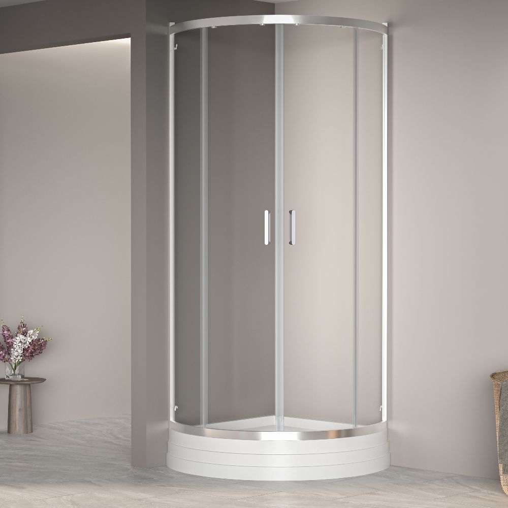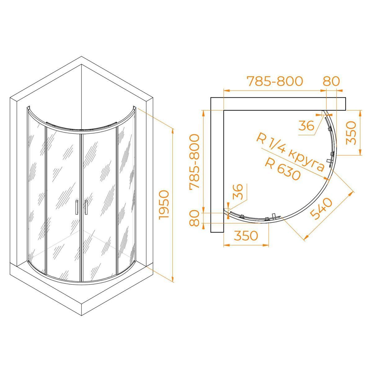 Душевой уголок полукруглый, две раздвижные двери. Радиус 1/4 круга.