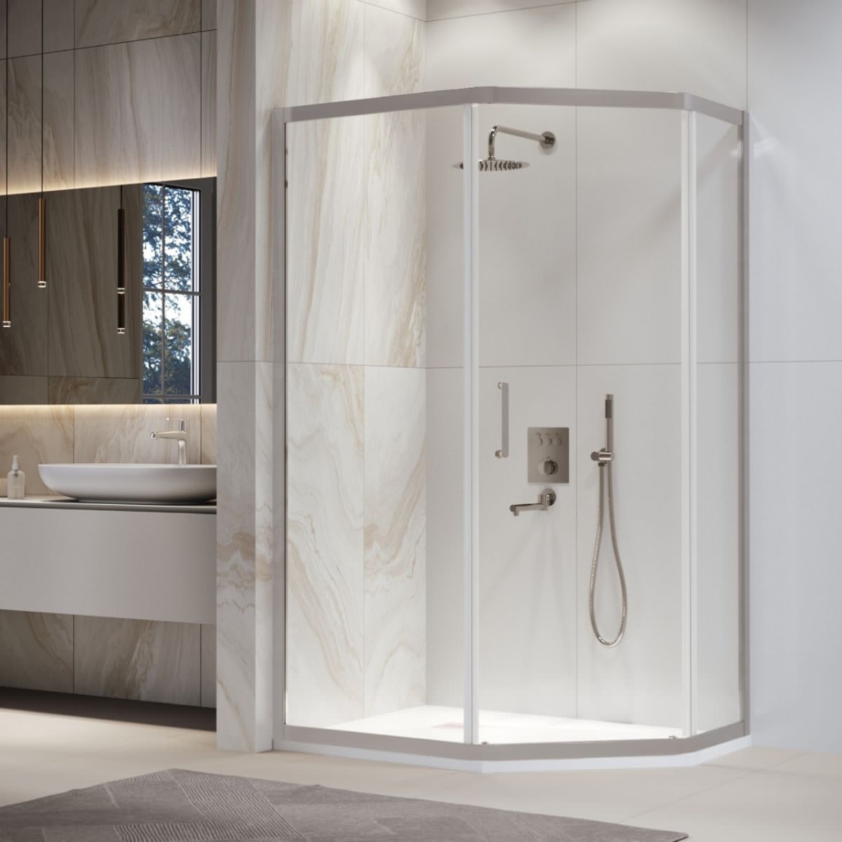Форма душевого угла RGW PA-86 асимметричная трапеция, что позволяет идеально вписаться в эстетику вашей ванной комнаты. Эта форма обеспечивает максимальное использование доступного пространства душевой зоны и создает комфортное ощущение простора.