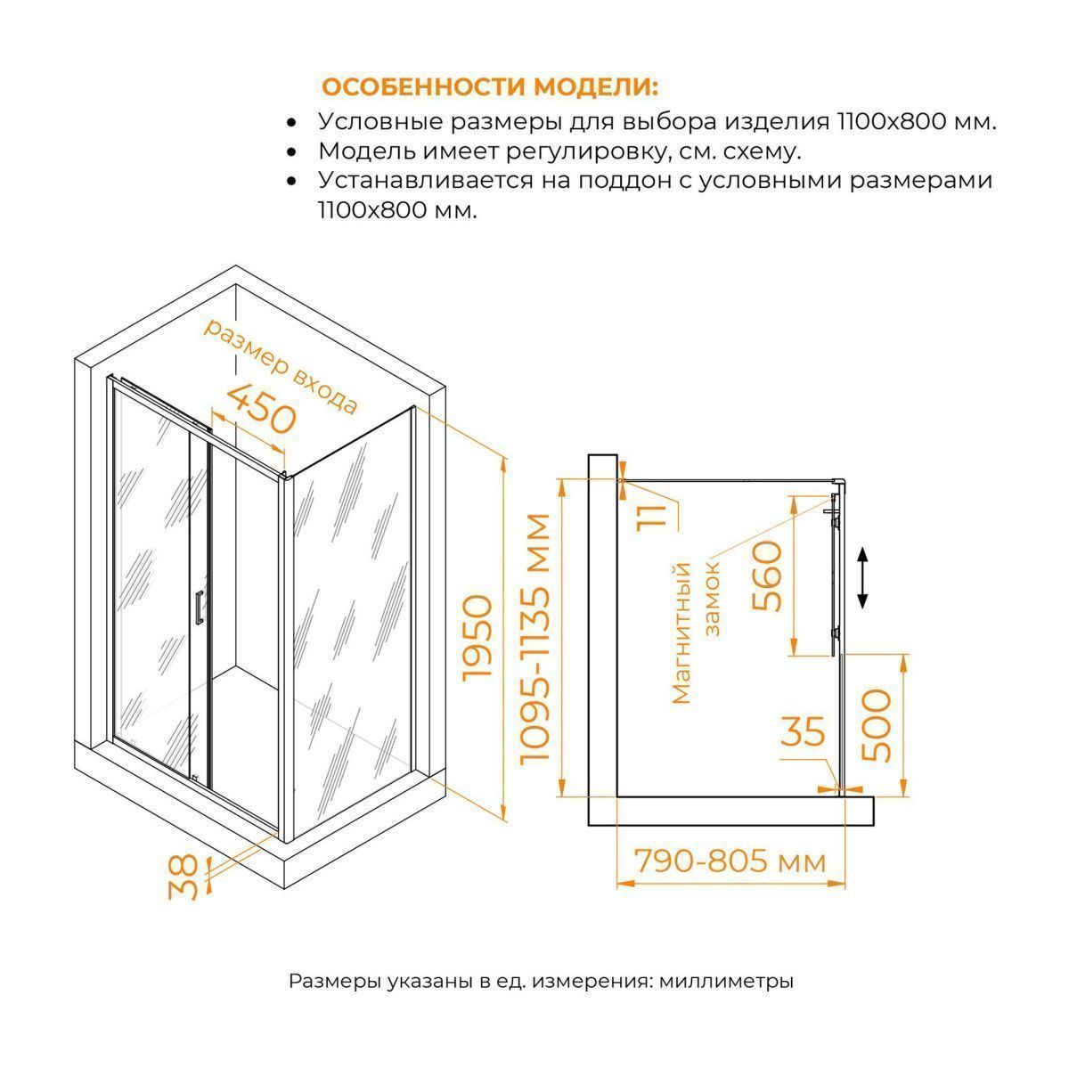 Высота душевого угла составляет 1950 мм, что позволяет вам чувствовать себя комфортно и свободно внутри него. Конструкция дверей раздвижная, обеспечивая плавное и легкое открывание и закрывание. Это особенно удобно в тех случаях, когда ванная комната имеет ограниченное пространство.