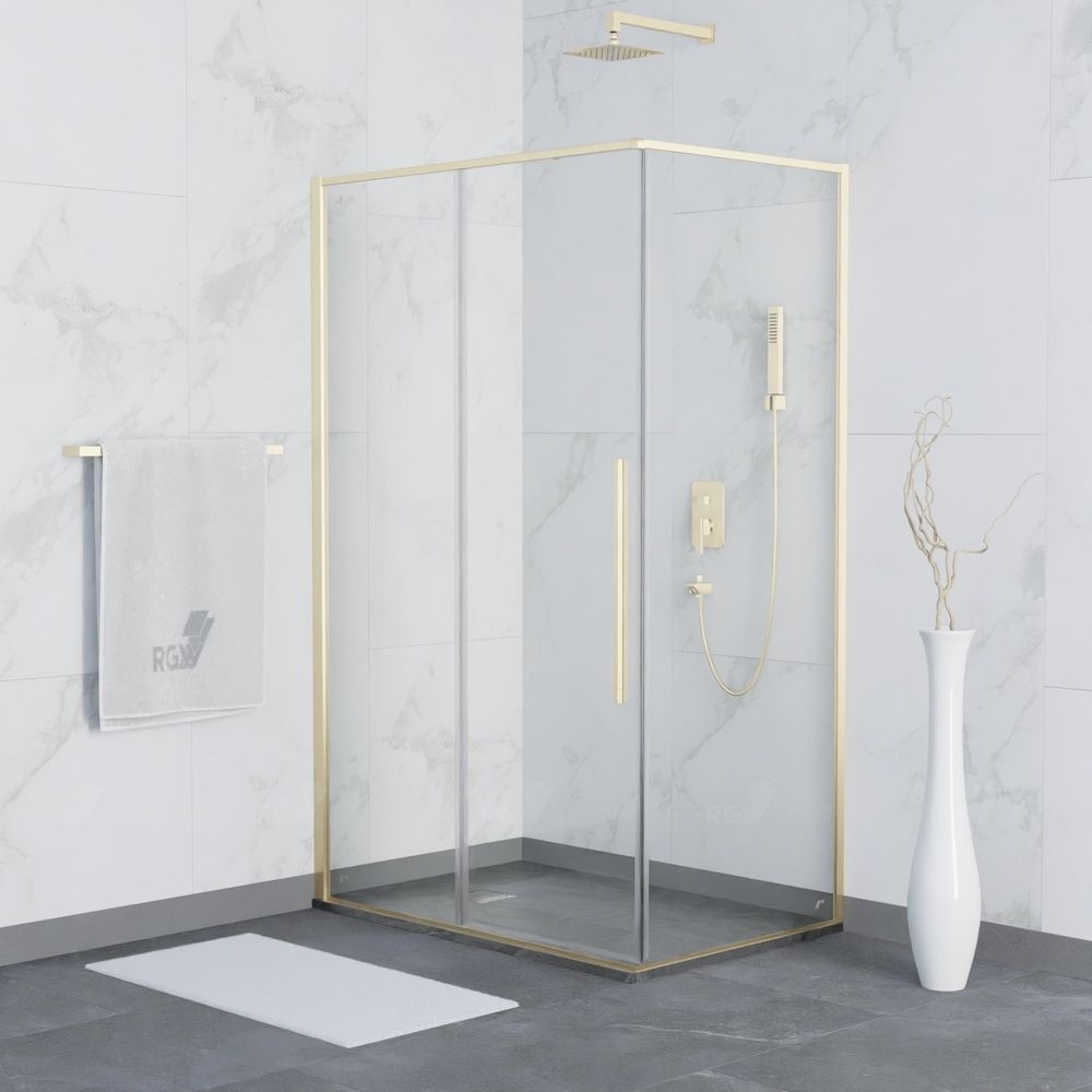 Золотой профиль душевого уголка выполнен из анодированного алюминия, что обеспечивает прочность и устойчивость изделия. Высота 1950 мм делает его удобным для людей любого роста.