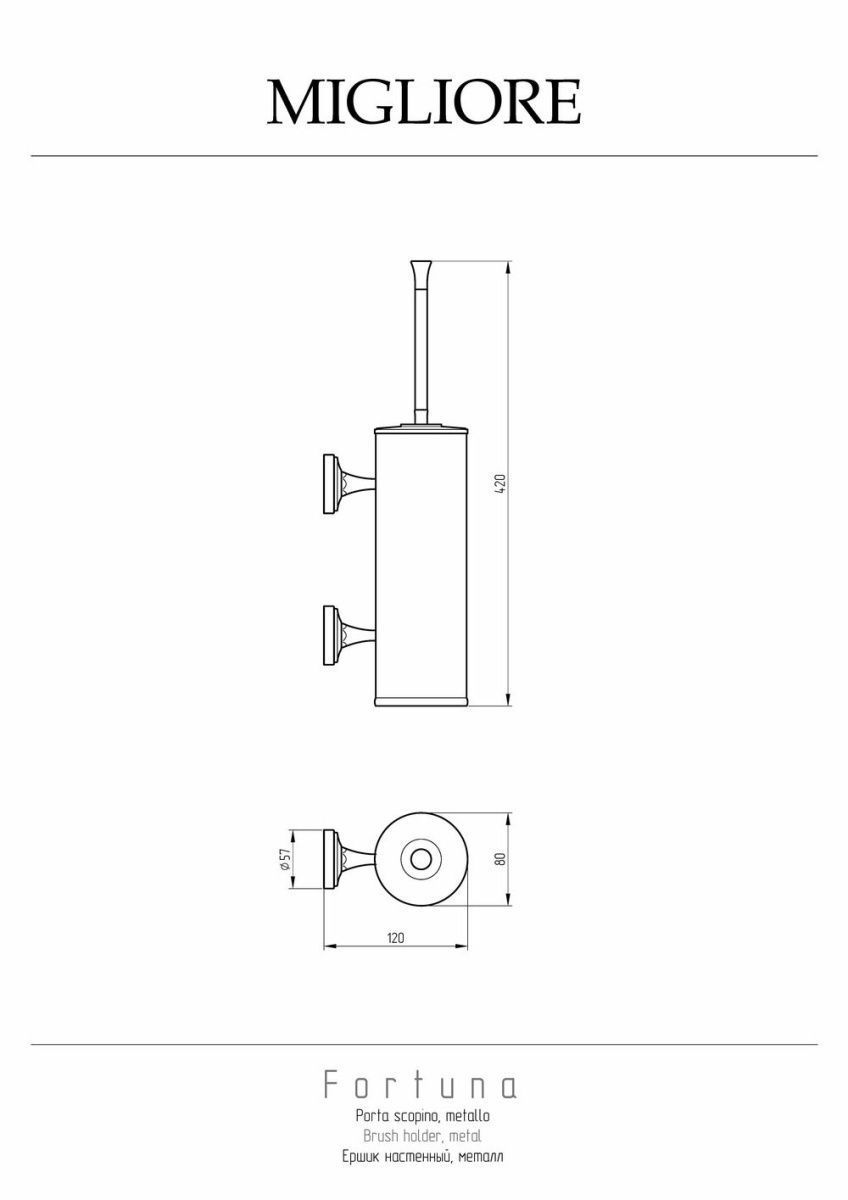 Настенный ершик серии FORTUNA бренда MIGLIORE   - это функциональный аксессуар для ванной комнаты. Внутри латунной колбы вставлена пластиковая колба, которую можно вынуть, чтобы помыть. Ерш вешается на стену и не мешает при уборке пола. Изделие выполнено из высококачественной латуни и имеет гальваническое покрытие золотом 24 карата. Внимание: золотое покрытие очень деликатное и для ухода рекомендуется использовать чистящее средство бренда MIGLIORE для смесителей и аксессуаров с деликатными покрытиями бронза, золото, медь и протирать мягкой ветошью.