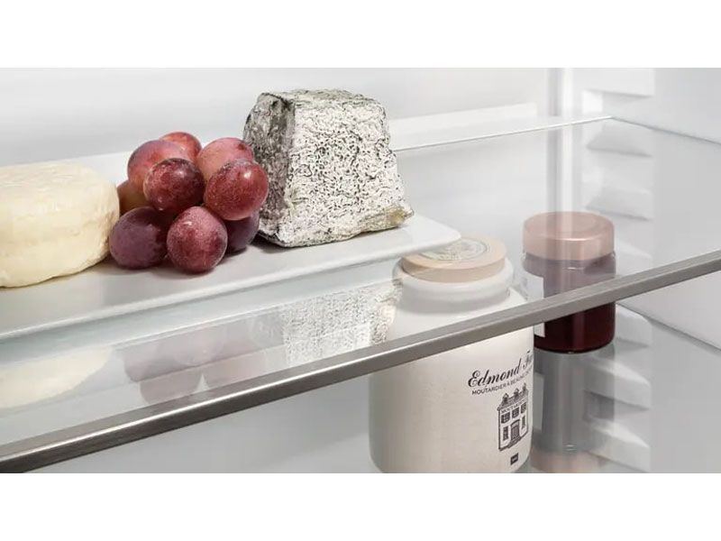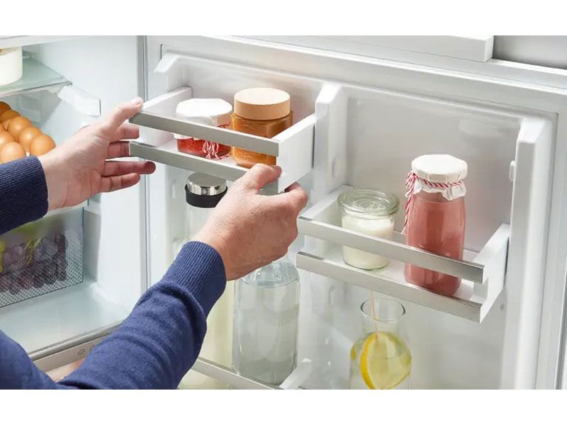 Еще больше возможностей для удобного хранения продуктов: две полки в половину ширины дверцы можно при необходимости перемещать и регулировать по высоте. Это безопасное и легко доступное место, например, для небольших баночек с завинчивающейся крышкой. Обрамление под нержавеющую сталь придает полкам элегантный внешний вид.