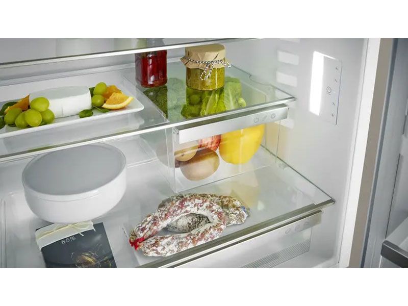 Светодиодная боковая подсветка освещает внутреннее пространство сбоку для хорошего обзора продуктов. Дополнительная особенность: светодиоды расположены перед стеклянными полками, так что даже полный холодильник освещается хорошо.