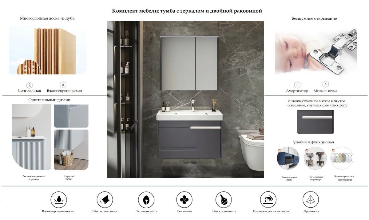 Тумба: удобный ящик, направляющие с доводчиком на полное выдвижение, удобная интегрированная ручка с подсветкой, фасады — МДФ в пленке, корпус — ДСП ламинированный. Подсветка включается при приближении на расстояние от 3-х метров, выключается при отсутствии движения в течение 30 секунд.