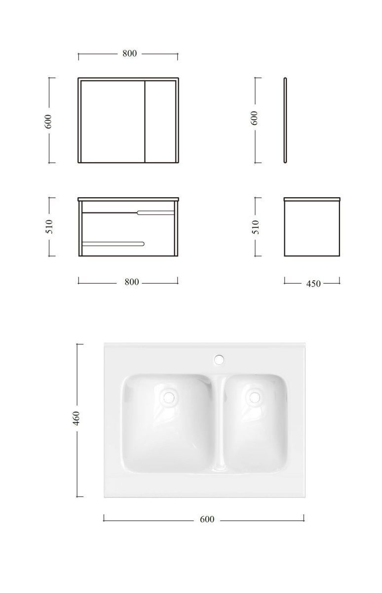 Зеркальный шкаф — зеркальные дверцы на петлях с плавным закрытием. 2 внутренние полки из ламинированного ДСП в цвет корпуса по длине шкафчика. Подсветка в верхней части, по всей длине. Включается при приближении на расстояние от 3-х метров, выключается при отсутствии движения в течение 30 секунд.