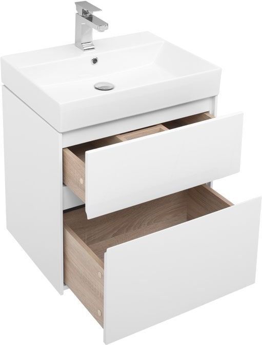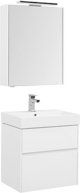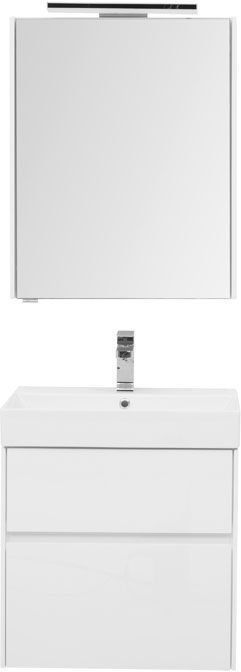 Комплект мебели для ванной Aquanet Бруклин 60 состоит из подвесной тумбы с раковиной и зеркального шкафа - все белого цвета В комплекте соединились модели из разных коллекций: тумба "Бруклин" шириной 60 см и зеркальный шкаф "Латина" шириной 60 см Корпус изделия выполнен из выкрашенного белой краской влагостойкого ЛДСП, фасады – из МДФ В тумбе интегрированные ручки, когда открывание происходит за счет выступающей детали верхней или нижней части фасада, которая срезана под углом, в результате чего образуется выемка, служащая ручкой Раковина из керамики с тонкими изящными бортиками идет размер в размер с тумбой, в результате чего все изделие выглядит как единое целое На контрасте с белизной внешних деталей стильно смотрится корпус выдвижных ящиков, выполненный в цвете «дуб сонома» Нижний ящик тумбы имеет большую зону хранения, верхний разделен на несколько отделений, которые помогут грамотно разложить все необходимое по своим местам