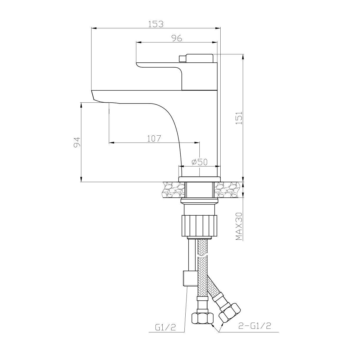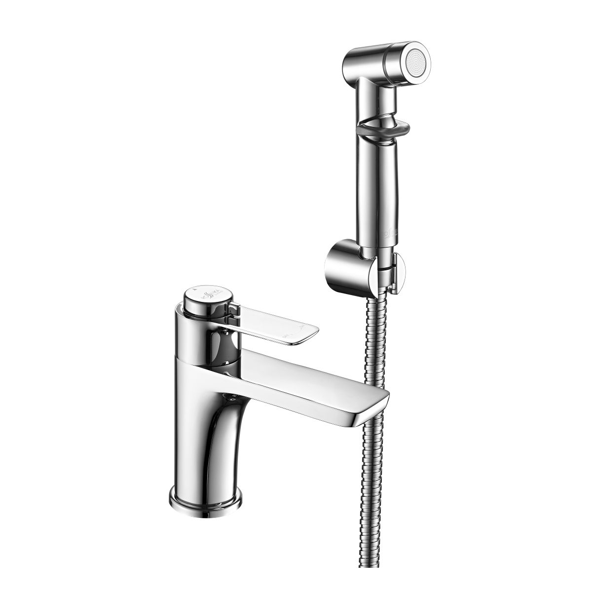 Смеситель термостатический для умывальника и биде монолитный, округлой формы. Корпус латунный, тип однорычажный, горизонтальный способ монтажа, гипкий тип подводки.
