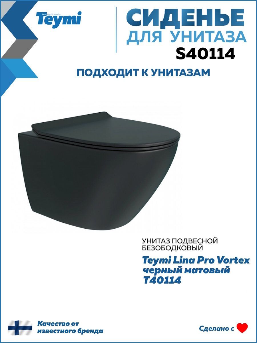 -- Унитаз подвесной Teymi Lina Pro Vortex черный матовый безободковый, сиденье микролифт T40114.