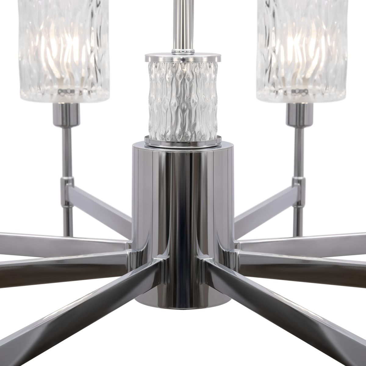 Хромированная металлическая арматура. Плафоны – фактурное прозрачное стекло. В качестве источника света используется лампа с цоколем Е14.
