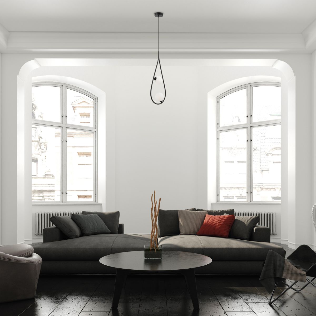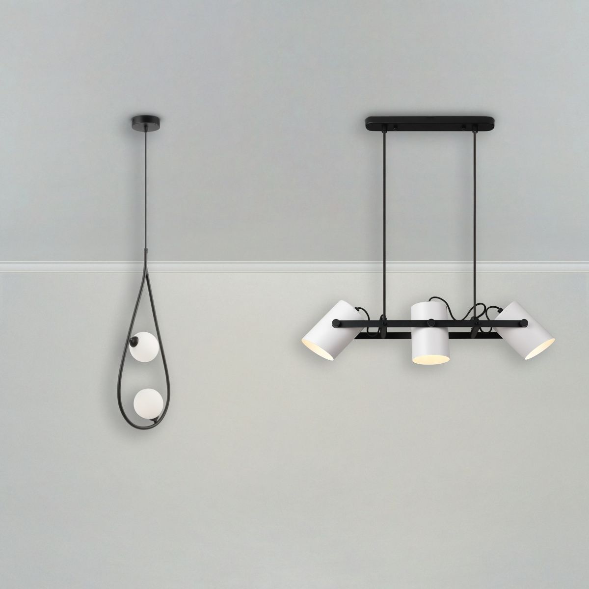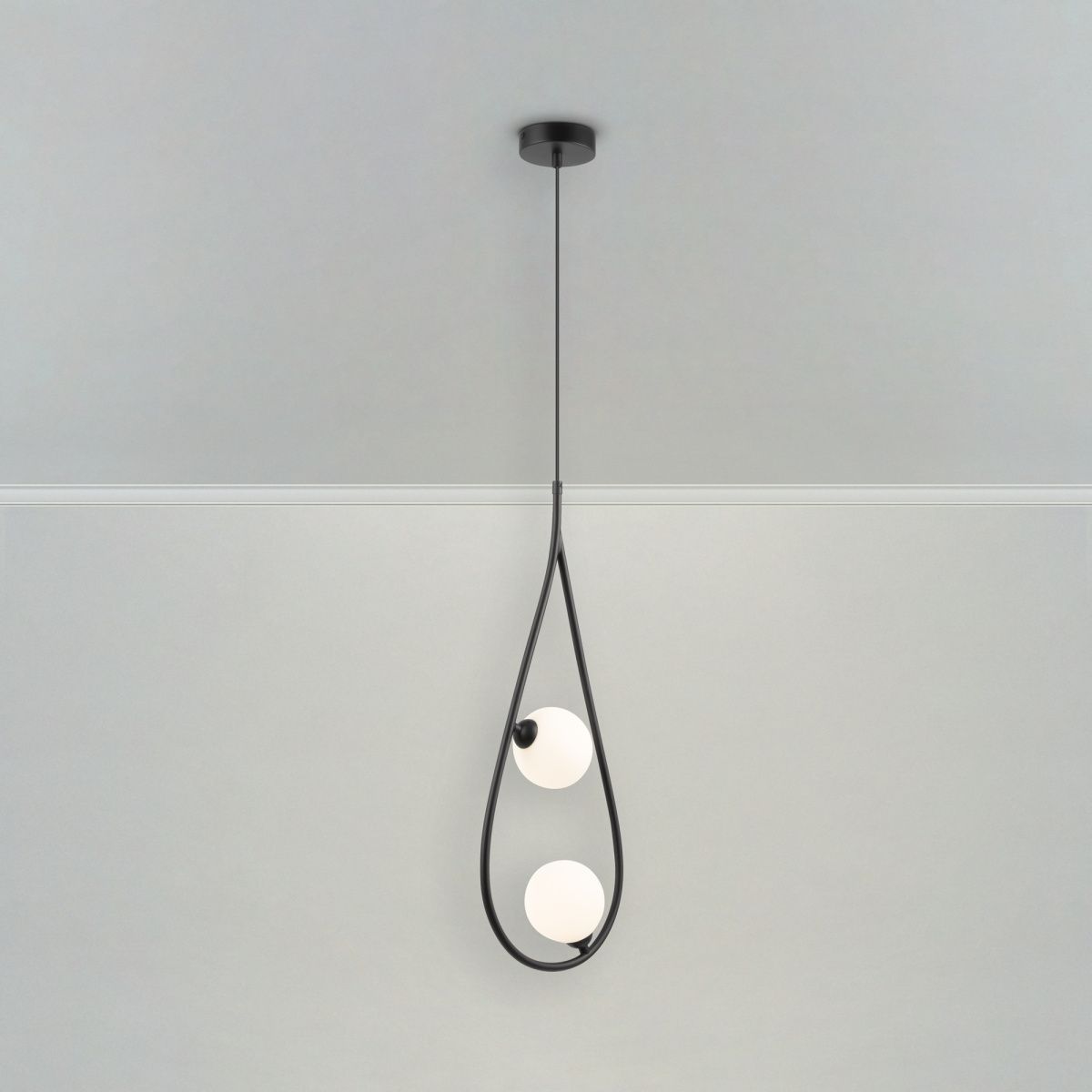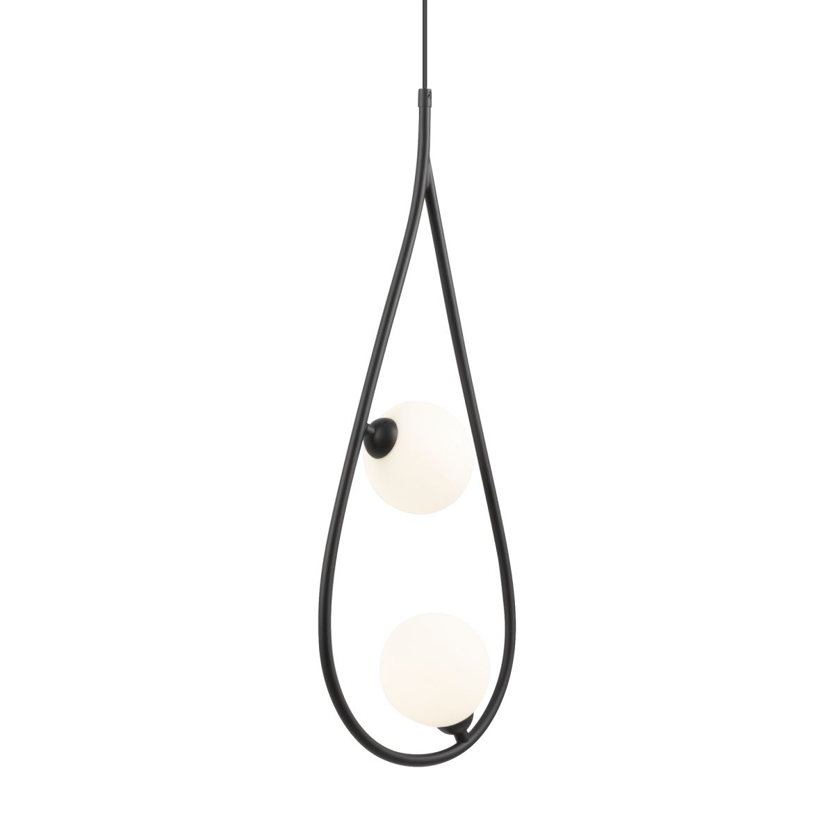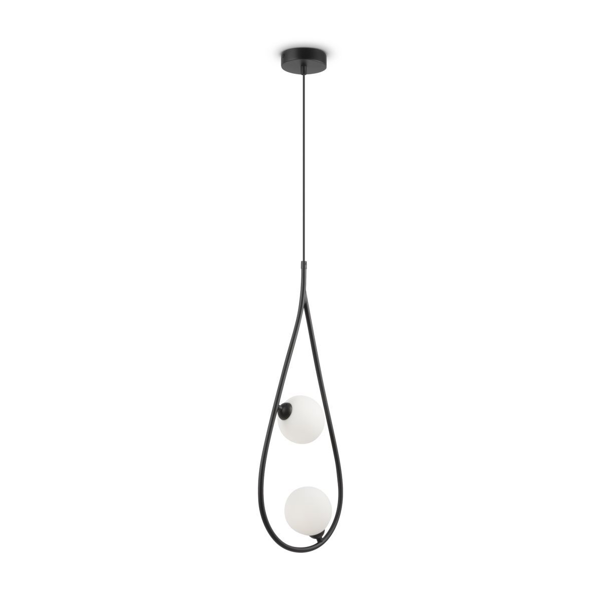 Металлическая арматура в черном цвете. Плафоны формы шар из матового белого стекла. Оригинальный силуэт арматуры с «нанизанными» плафонами. Удлиненный кабель для помещений с высокими потолками. Источник света – лампа G9.
