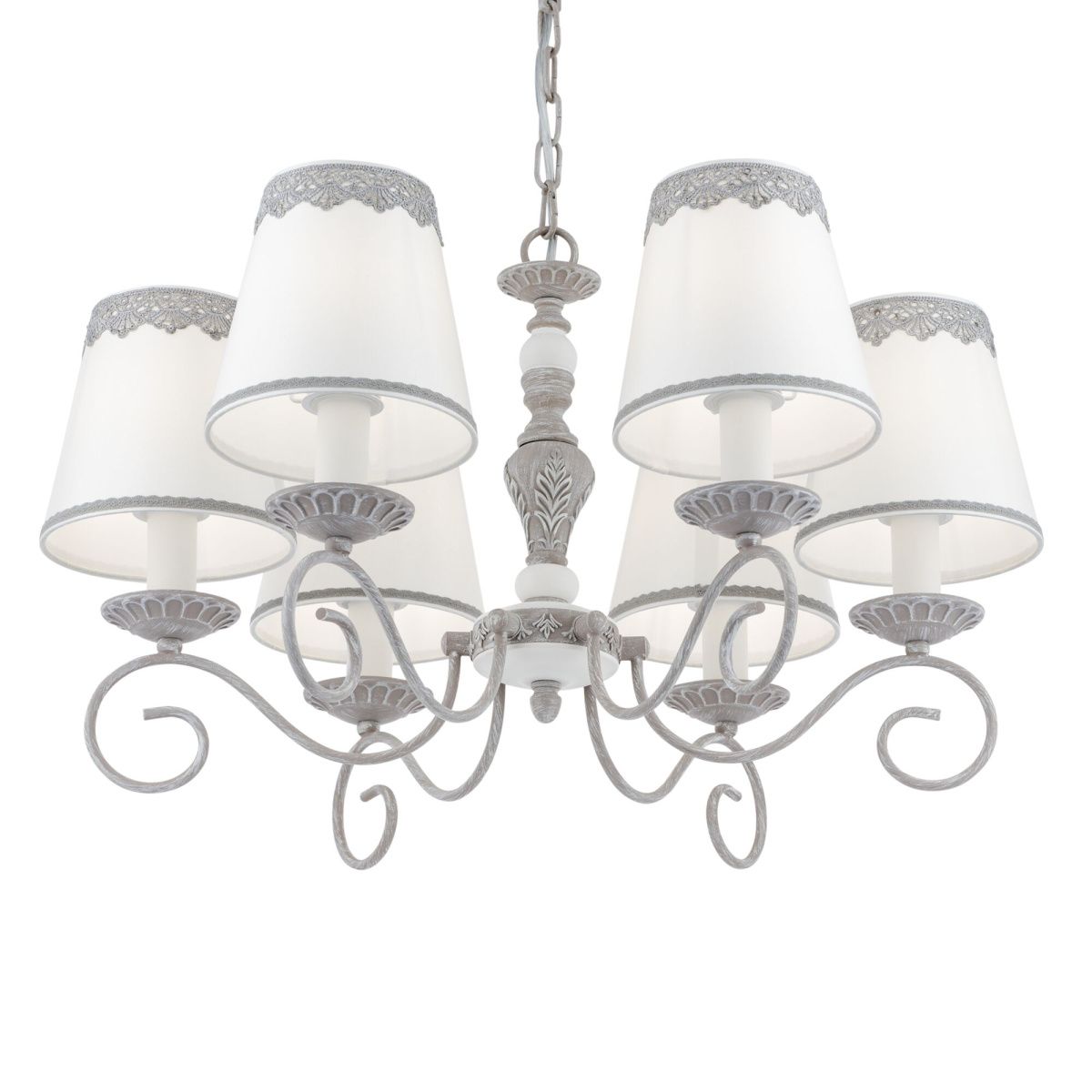 Арматура из металла в сером цвете, имитация естественных потертостей. Белые абажуры из хлопка на ПВХ. Кружевная окантовка. Декоративные элементы: рама для фото  у настольной лампы:, фигурки птиц. Регулируемая высота подвесных светильников. Источник света - лампа с цоколем Е14. У торшера - Е27.