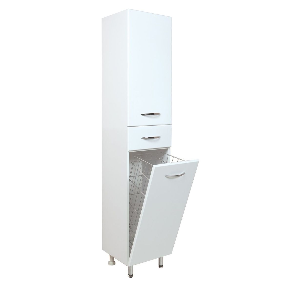 Большое отделение сверху за распашной дверцей с механизмом плавного закрывания, небольшой ящик с направляющими полного выдвижения посередине и отделение с корзиной для белья внизу шкафа обеспечит бережное хранение всех необходимых в ванной комнате вещей. Размер бельевой корзины: 270*370*630.