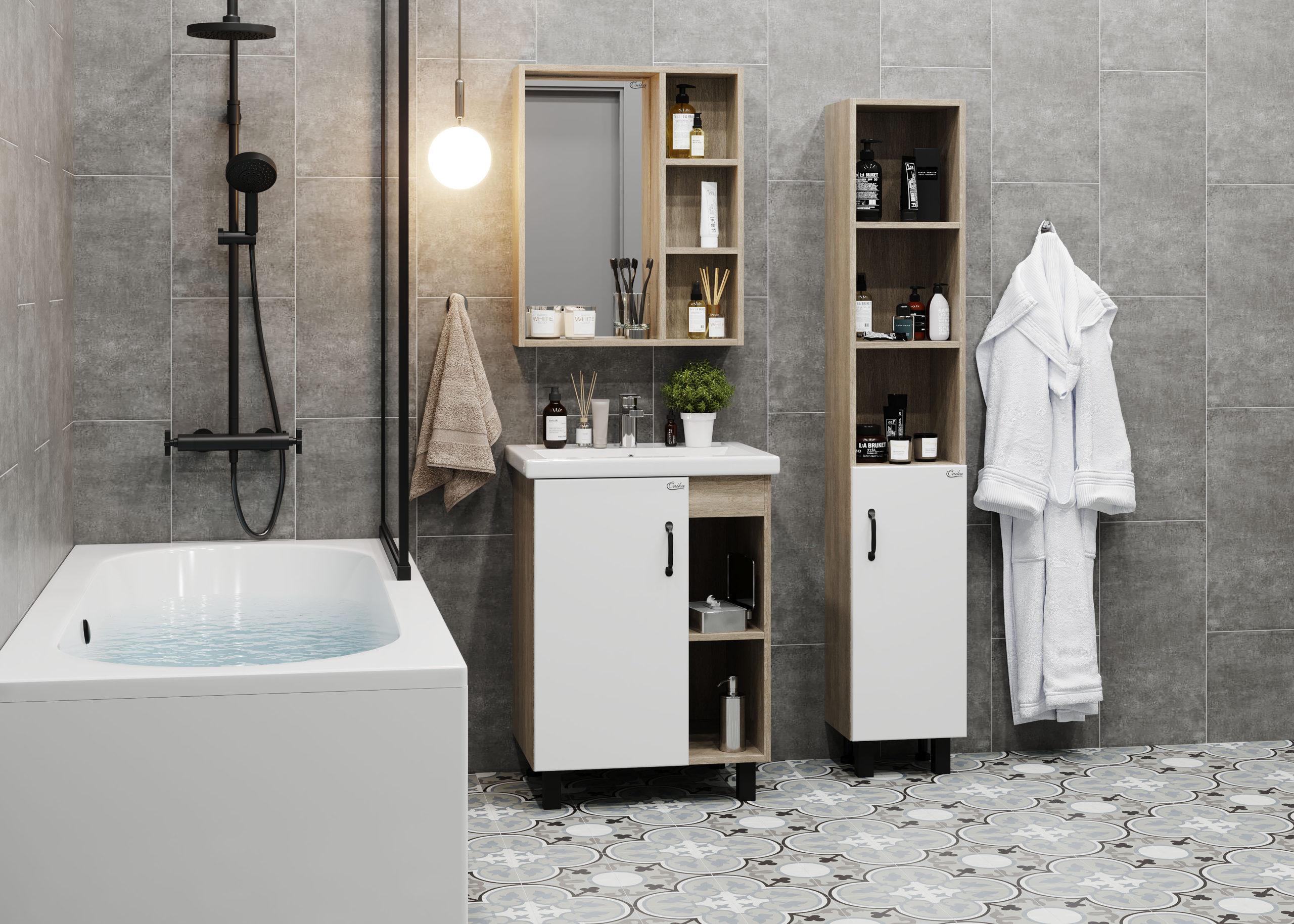Открытые полки сверху обеспечивают быстрый доступ к часто используемым аксессуарам, а пространство за распашной дверцей снизу, снабженной системой плавного закрывания, станет удобным местом для хранения различных бытовых принадлежностей.