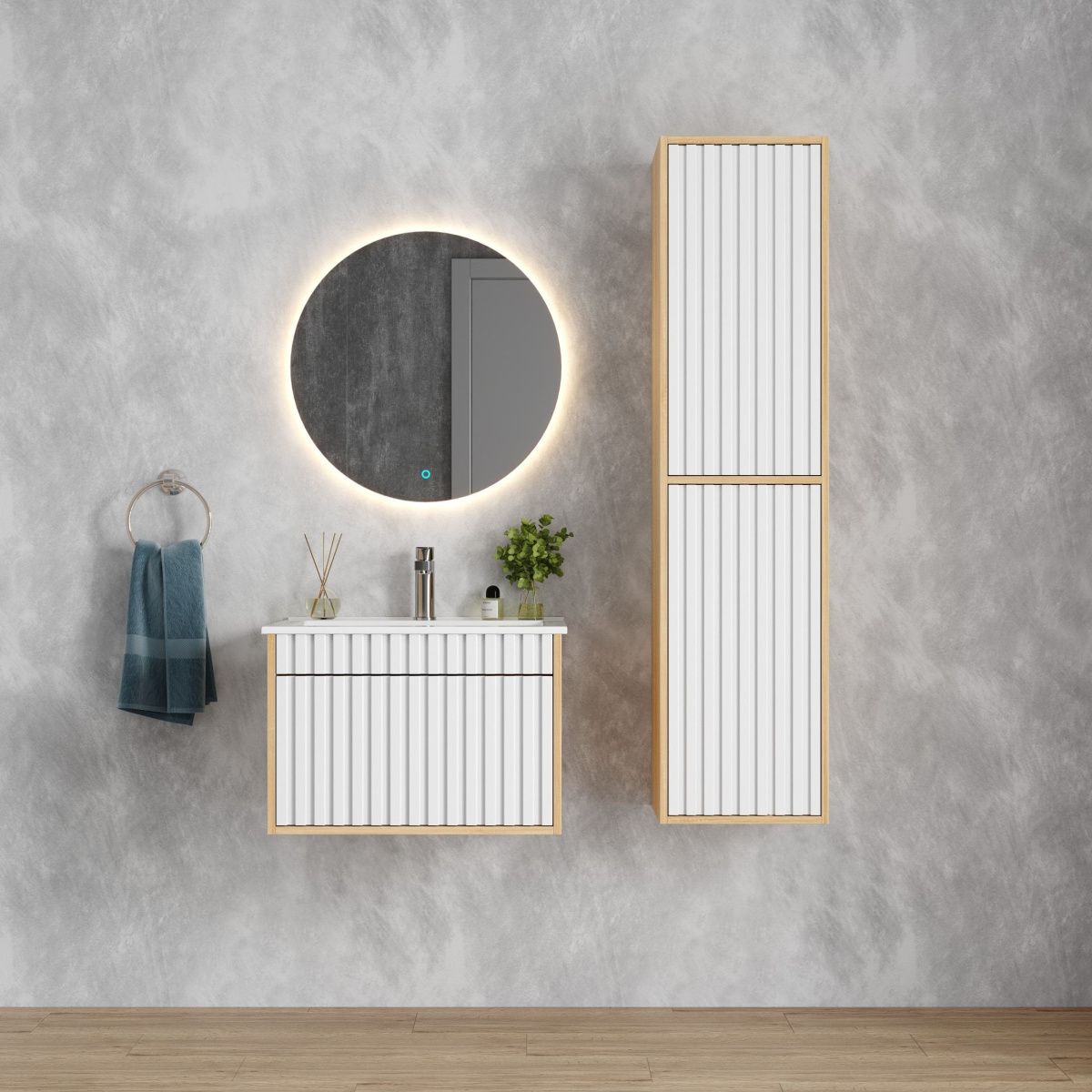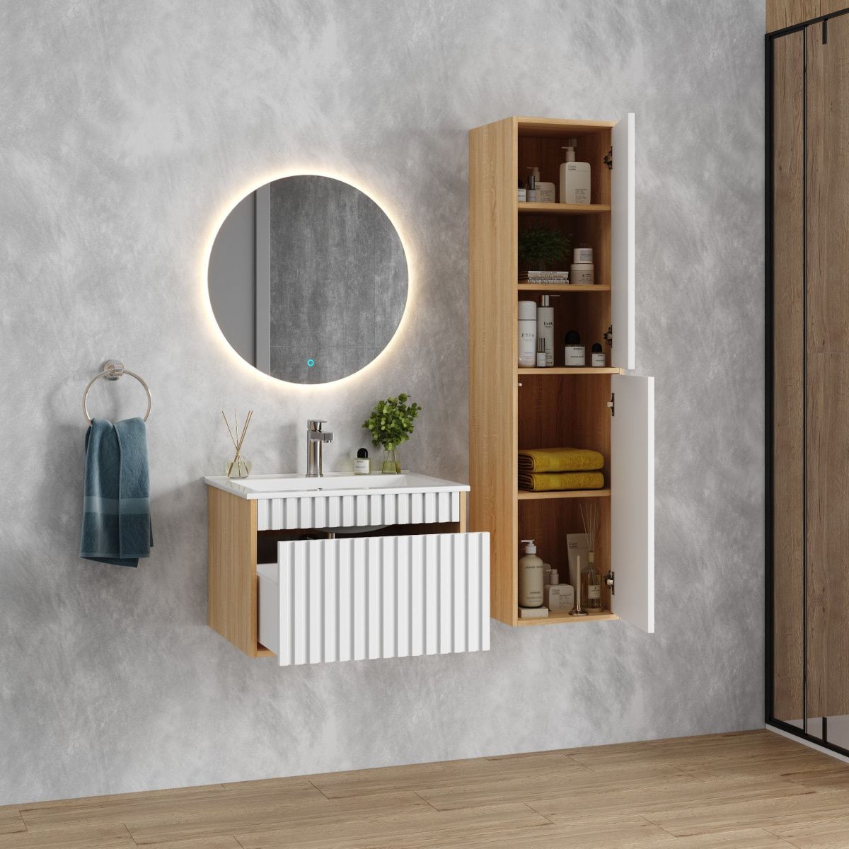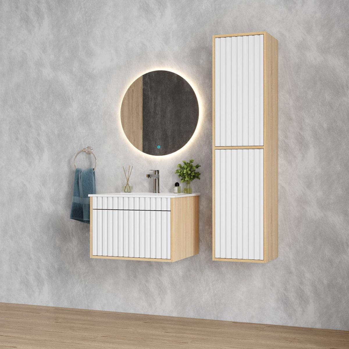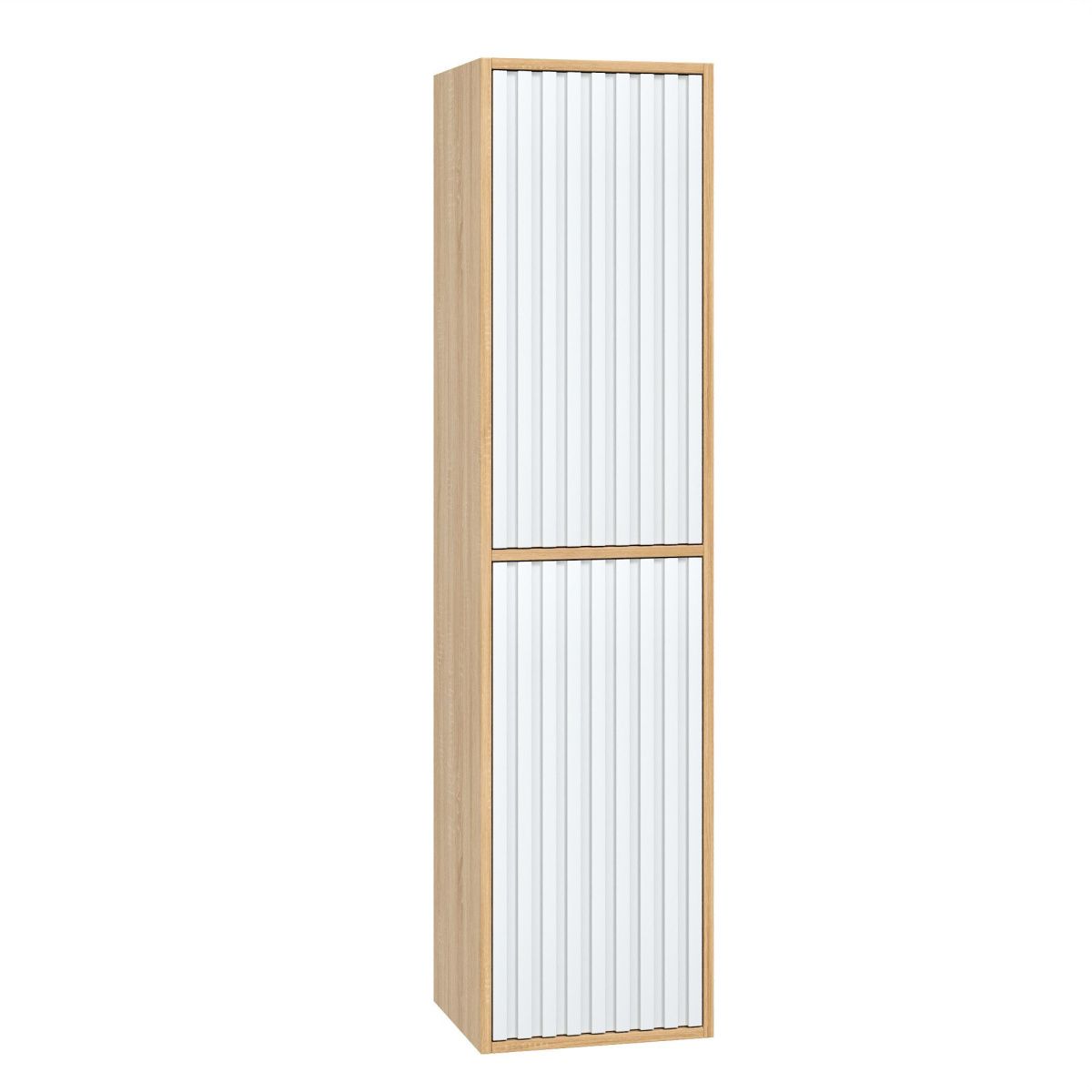 Рифленый белый матовый фасад с покрытием SoftTouch и корпус цвета дуба с роскошной текстурой подчеркнет изысканный вкус владельца и станет центральным элементом декора.
