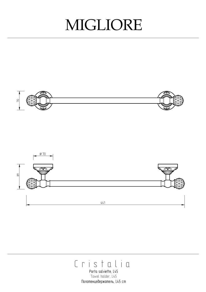 Полотенцедержатель коллекции CRISTALIA бренда MIGLIORE  - функциональный аксессуар для ванной комнаты. Его длина 45 см, что позволяет разместить его даже на небольшом пространстве. Используется, как правило, для небольшого полотенца для рук и лица. Также удобен рядом с биде. Аксессуар украшен кристаллами Сваровски.