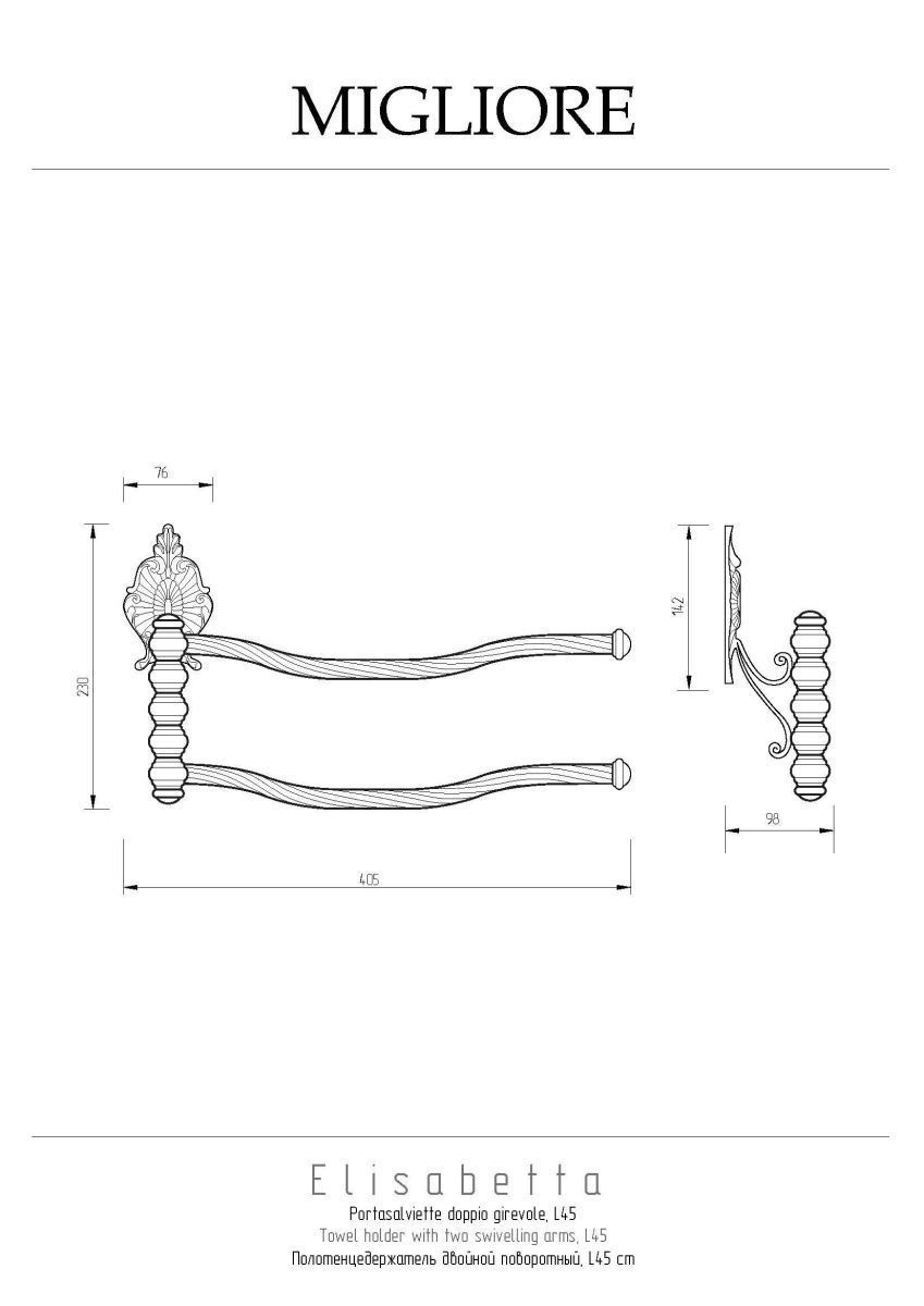 Полотенцедержатель двойной поворотный коллекции ELISABETTA бренда MIGLIORE длиной 45 см очень удобен в использовании — для него достаточно небольшого пространства, и  держатели можно развернуть в одну или другую сторону, в зависимости от наличия места на стене. Розетки аксессуара имеет необычную форму, и удобный крепеж.