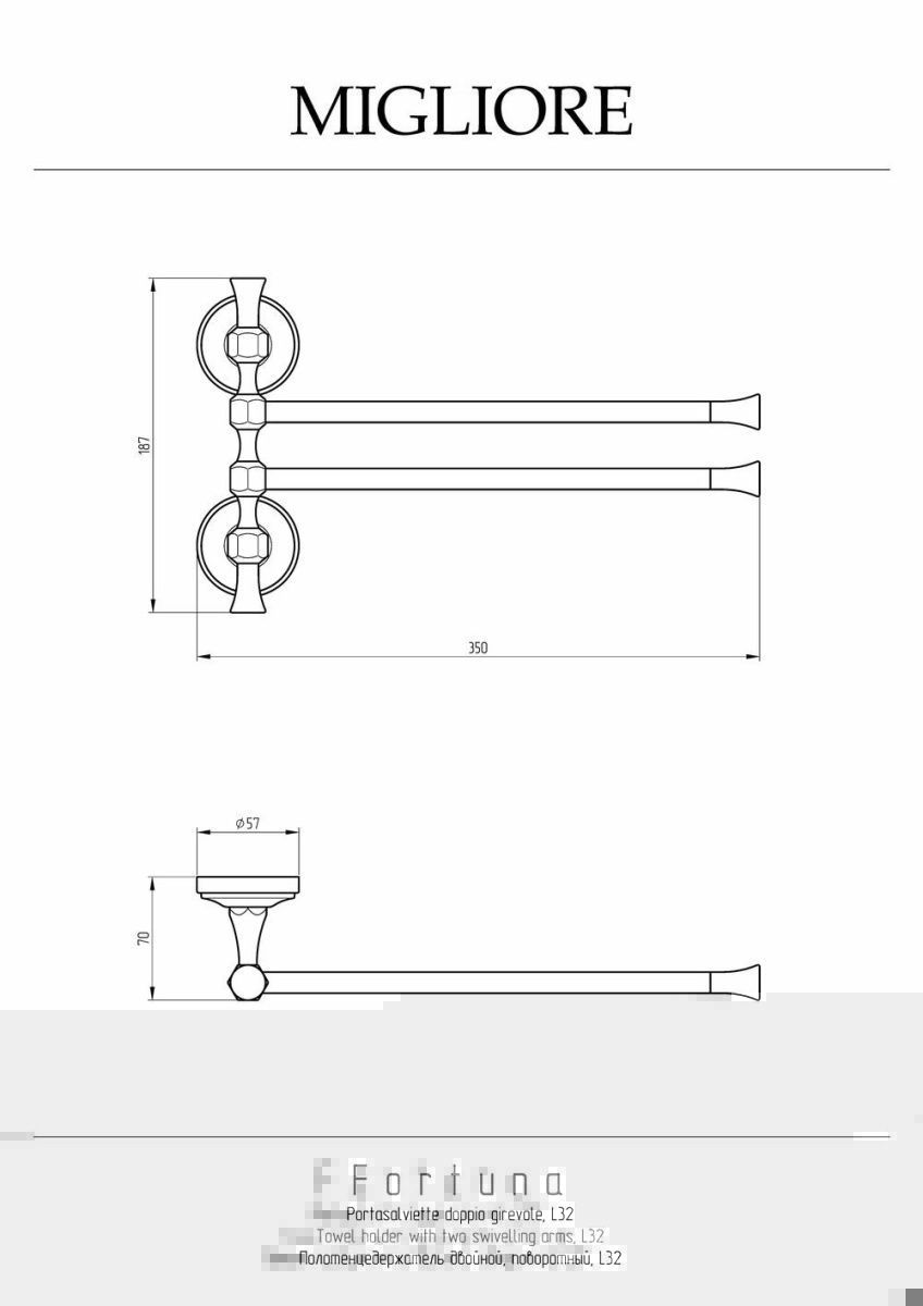 Полотенцедержатель двойной поворотный серии FORTUNA бренда MIGLIORE длиной 32 см очень удобен в использовании. Чтобы повесить его достаточно небольшого пространства, держатели можно размернуть в одну или другую сторону в зависимости от места на стене. Изделие выполнено из латуни и имеет высококачественное хромо-никелиевое покрытие, которое при правильном уходе надолго сохранит  свой блеск. Рекомендуется использовать чистящее средство бренда MIGLIORE для смесителей и аксессуаров с хромированным покрытием.