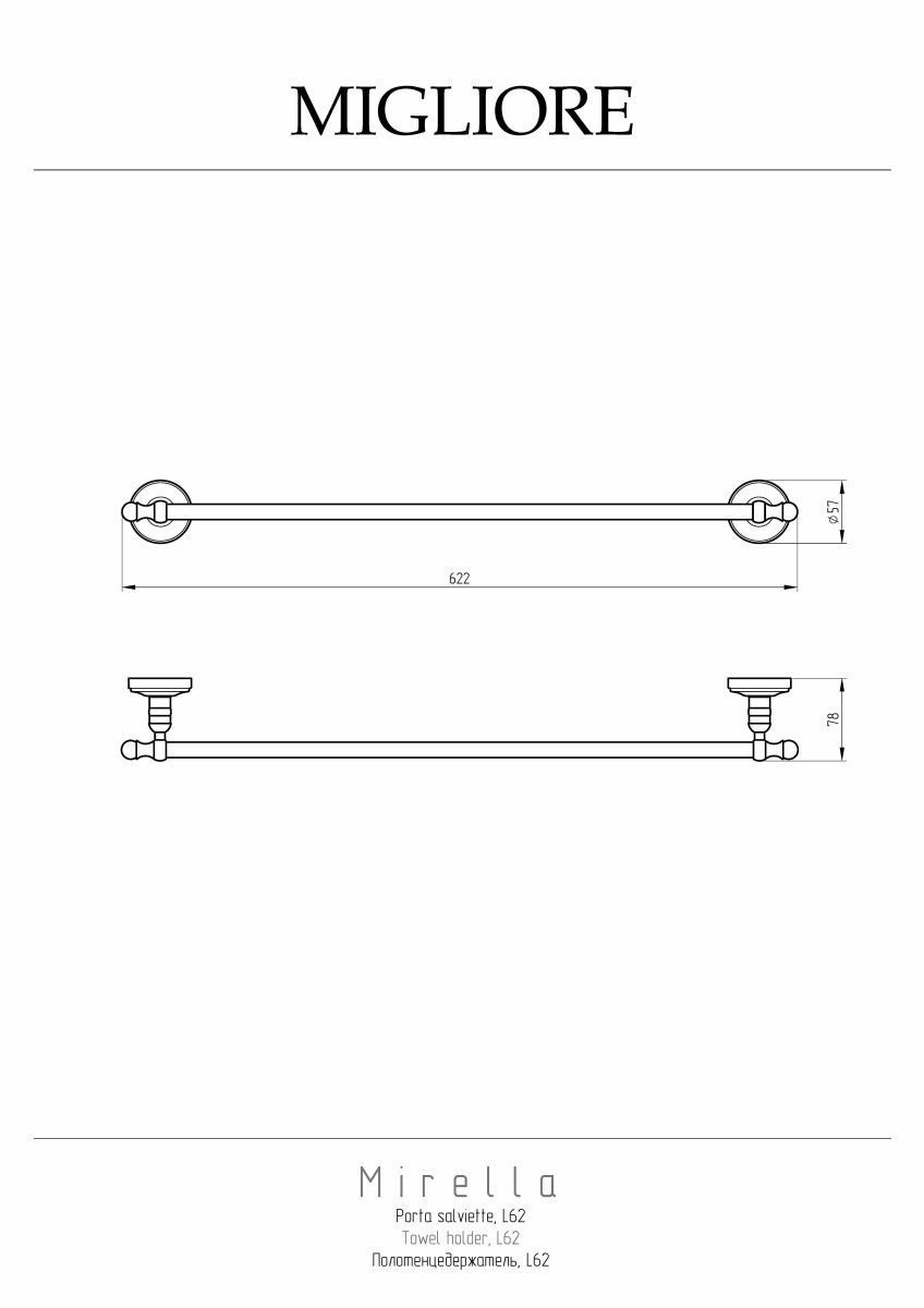Полотенцедержатель серии MIRELLA бренда MIGLIORE  - функциональный аксессуар для ванной комнаты. Его длина 62 см подходит для любого полотенца для рук, лица или тела. Материал — латунь, покрытие цвета бронза. Внимание: бронзовое покрытие достаточно деликатное и для ухода рекомендуется протирать изделие мягкой безворсовой тряпочкой с мыльным раствором и вытирать насухо или использовать чистящее средство бренда MIGLIORE для смесителей и аксессуаров с деликатными покрытиями бронза, золото, медь.