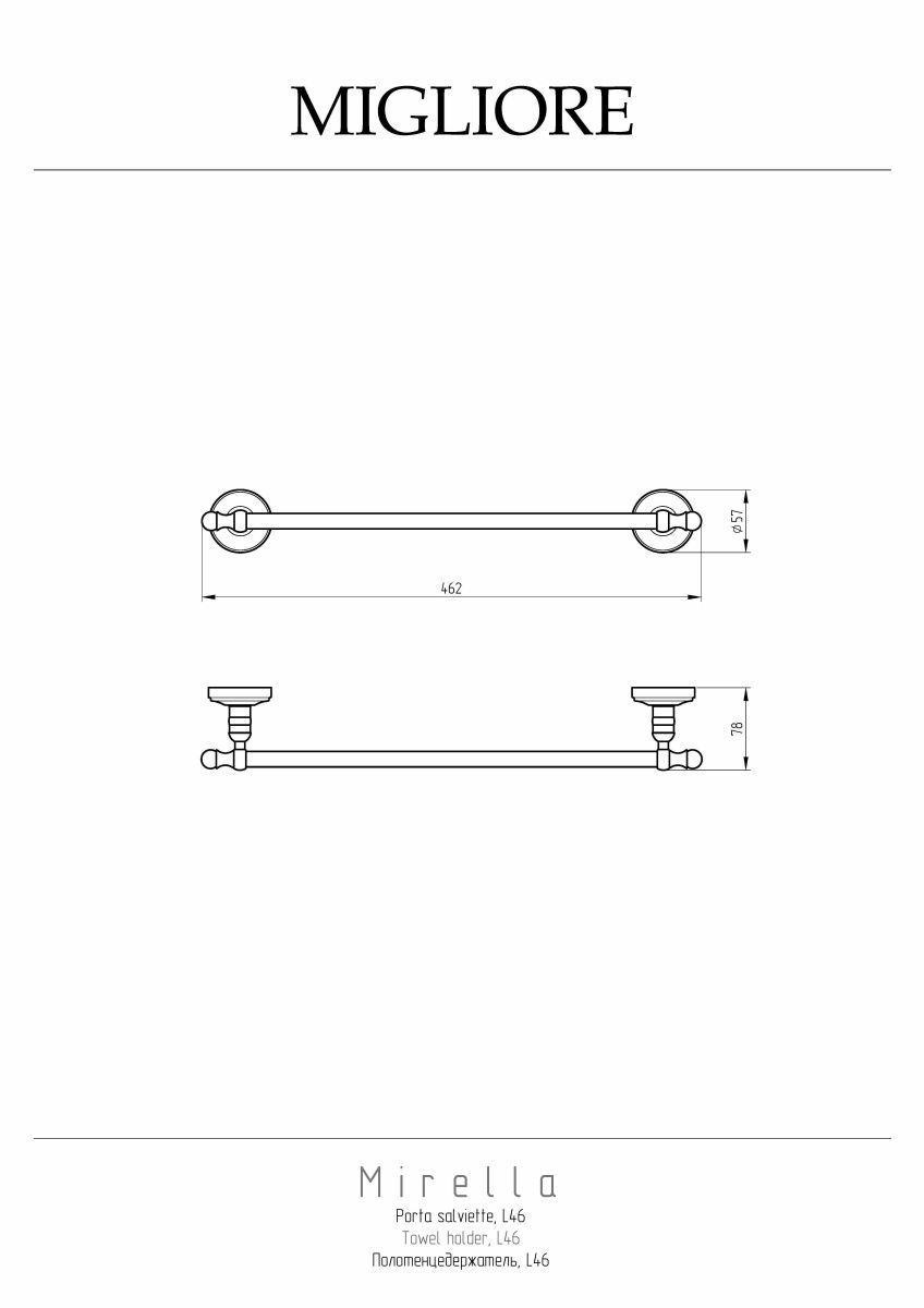 Полотенцедержатель серии MIRELLA бренда MIGLIORE  - один из необходимых аксессуаров для ванной комнаты. Его длина 46 см, что позволит разместить его даже на небольшом пространстве. Используется, как правило, для небольшого полотенца для рук и лица. Также удобно разместить также рядом с биде. Изделие выполнено из латуни и имеет высококачественное хромо-никелиевое покрытие, которое при правильном уходе надолго сохранит  свой блеск. Рекомендуется использовать чистящее средство бренда MIGLIORE для смесителей и аксессуаров с хромированным покрытием.