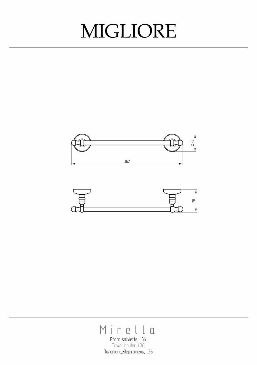 Полотенцедержатель серии MIRELLA бренда MIGLIORE  - функциональный аксессуар для ванной комнаты. Его длина 62 см подходит для любого полотенца для рук, лица или тела. Изделие выполнено из высококачественной латуни и имеет гальваническое покрытие золотом 24 карата. Внимание: золотое покрытие очень деликатное и для ухода рекомендуется использовать чистящее средство бренда MIGLIORE для смесителей и аксессуаров с деликатными покрытиями бронза, золото, медь и протирать мягкой ветошью.