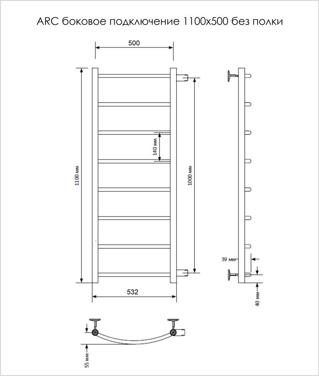 Полотенцесушитель водяной INDIGO Arc с боковым подключением в размере 1100х500 (ВхШ) выполнен из нержавеющей стали.