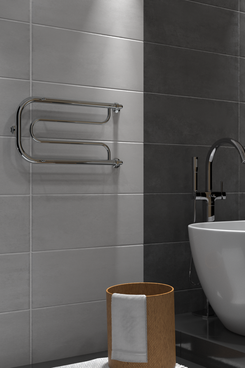 Полированная нержавейка придает изделию современный вид, устойчива к коррозии и легко очищается. Наличие полочки позволяет удобно разместить полотенца для быстрого высыхания и поддержания порядка в ванной комнате.