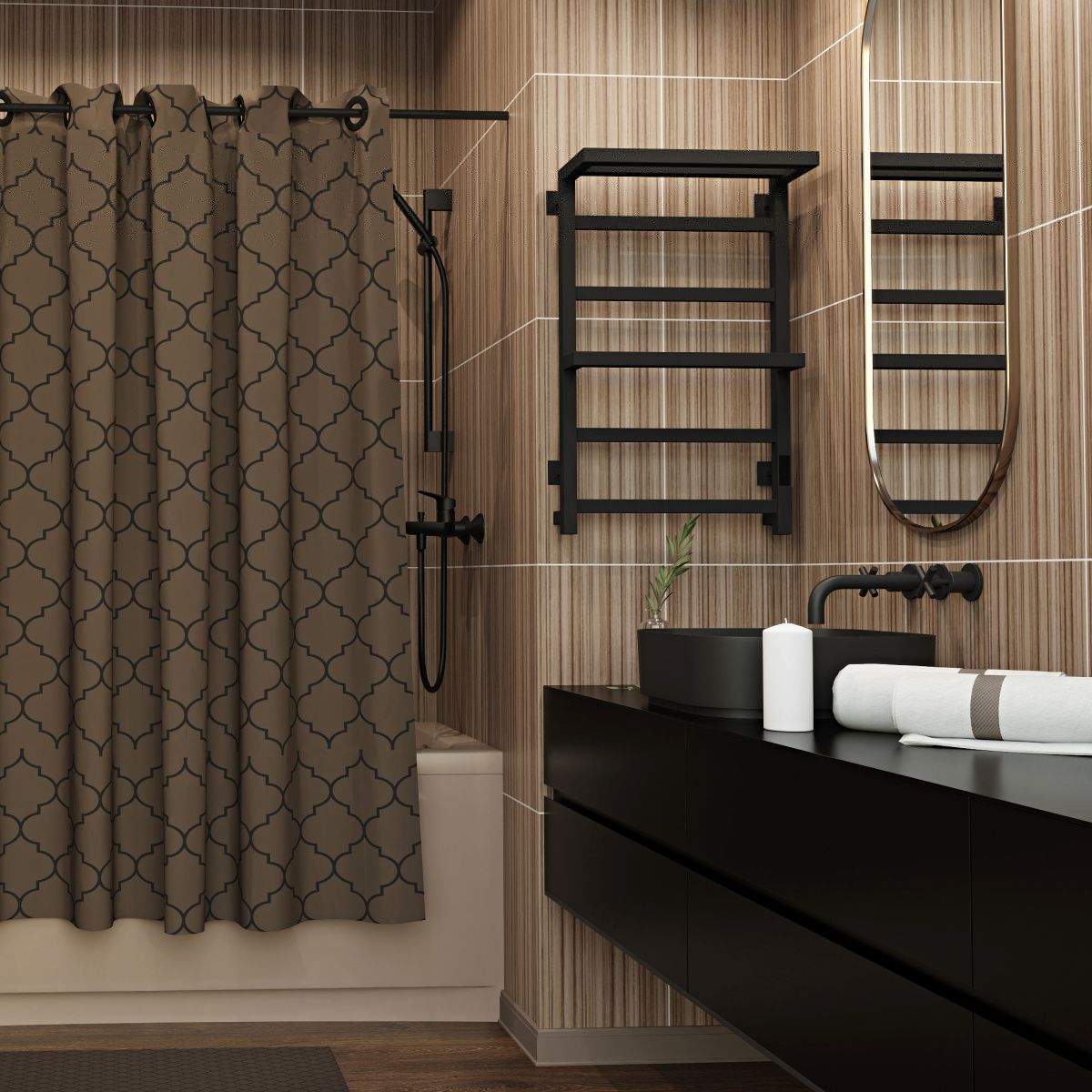 Полотенцесушитель электрический INDIGO Forte в размере 800х500 (ВхШ) в цвете черный матовый. Профильный полотенцесушитель с полкой, имеет одну скобообразную перекладину, на которой удобно будет разместить большое полотенце или другой текстиль на просушку. Модель имеет терморегулятор нагрева, у которого три режима: 40, 45, 50 градусов и таймер на отключение через 2, 4, 6 часов.  Подключение осуществляется двумя способами: скрытое подключение к электропроводке через модуль скрытого подключения в стену или прямым электропроводом. Длина прямого провода 1,1 метр. Изделие окрашено порошковой краской по специальной технологии, которая придает ему матовое, тактильно приятное покрытие, без разводов во время эксплуатации. Специальная технология нагревательного кабеля защищает полотенцесушитель от перегрева, что влияет на длительные сроки службы. В комплектации идут 4 телескопических держателя, комплект монтажа и гарантийный паспорт.
