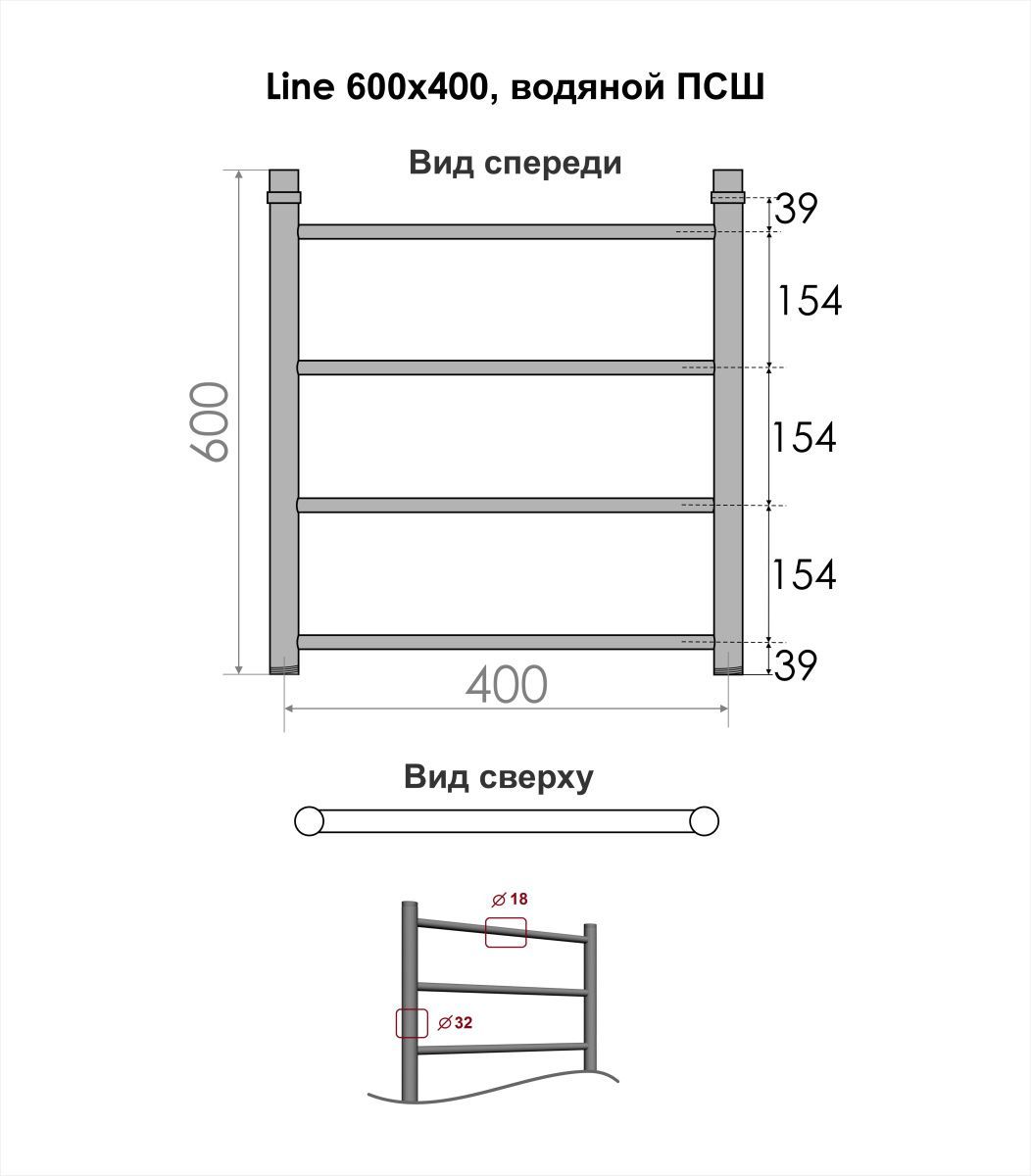 Полотенцесушитель водяной INDIGO Line в размере 600х400 (ВхШ) выполнен из нержавеющей стали.