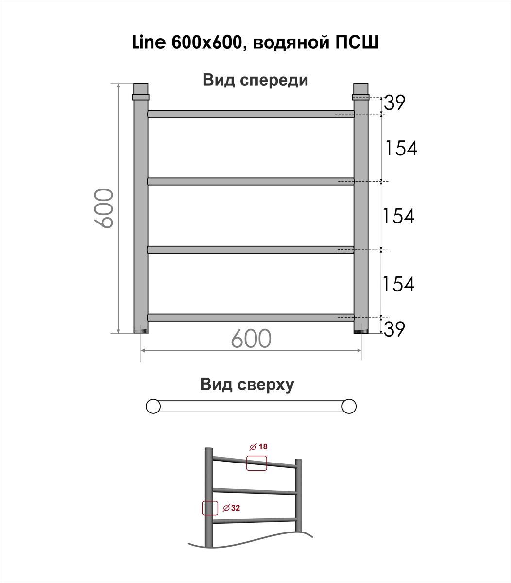 Полотенцесушитель водяной INDIGO Line в размере 600х600 (ВхШ) выполнен из нержавеющей стали.