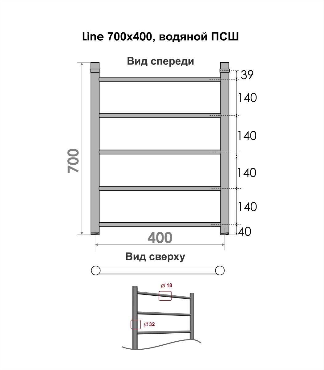 Полотенцесушитель водяной INDIGO Line в размере 700х400 (ВхШ) выполнен из нержавеющей стали.