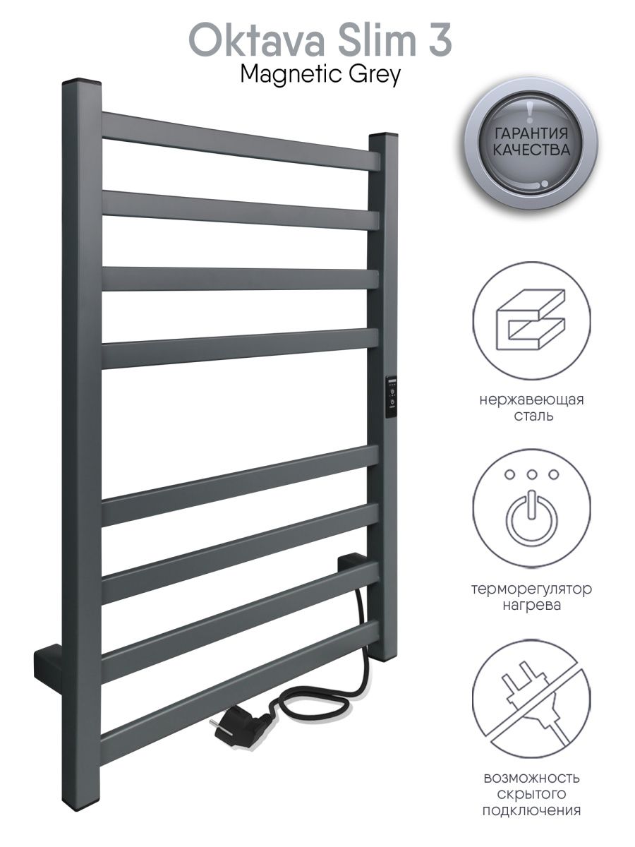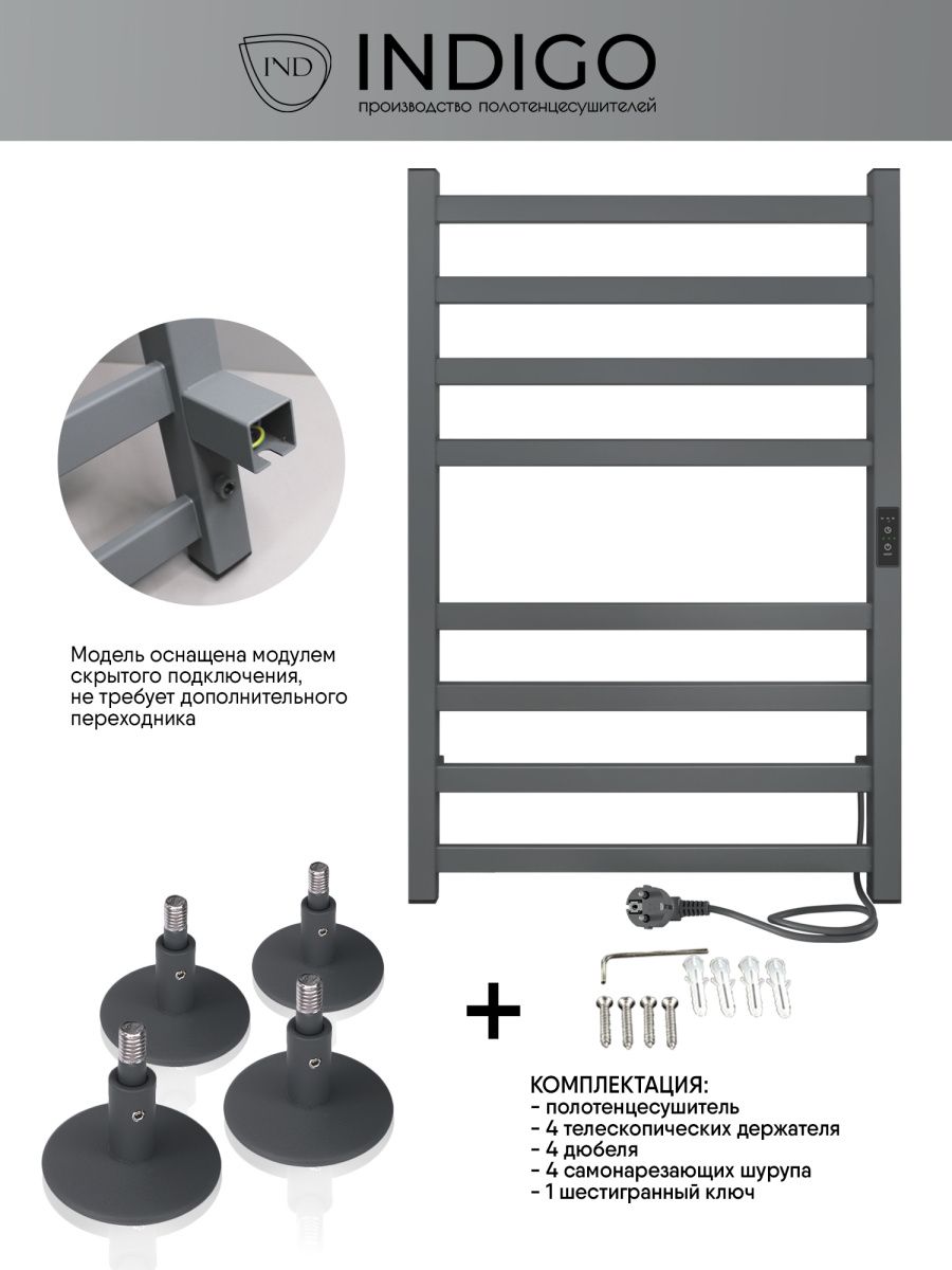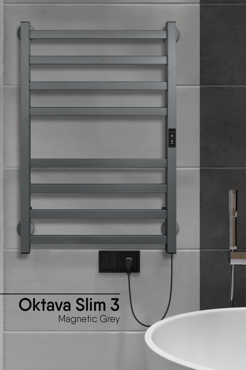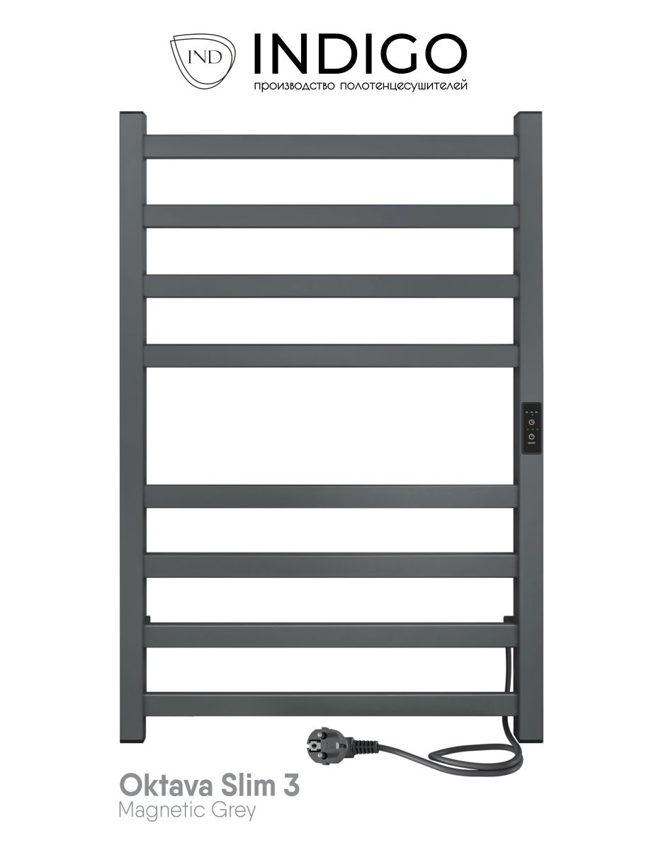 Полотенцесушитель электрический INDIGO Oktava Slim 3 в размере 800х500 (ВхШ) выбирают за его технологичность и универсальность. Модель имеет терморегулятор нагрева, у которого три режима: 40, 45, 50 градусов и таймер на отключение через 2, 4, 6 часов. Универсальность изделия предусматривает подключение через провод, который переставляется на нужную вам сторону или скрытое подключение без покупки дополнительного переходника. Длина провода  1,1 метр. Изделие окрашено порошковой краской по специальной технологии. Полотенцесушитель относится к энергоэффективным изделиям, потребляемая мощность в данном размере 90 Вт. Специальная технология нагревательного кабеля защищает полотенцесушитель от перегрева что влияет на длительные сроки службы. В комплектации идут 4 телескопических держателя, комплект монтажа и гарантийный паспорт. Полотенцесушитель INDIGO Oktava Slim 3 застрахован и имеет гарантию 3 года.  Выбирая INDIGO вы получаете надежный продукт из нержавеющей стали с гарантией качества от российского производителя