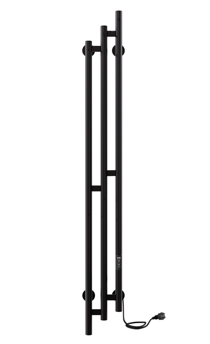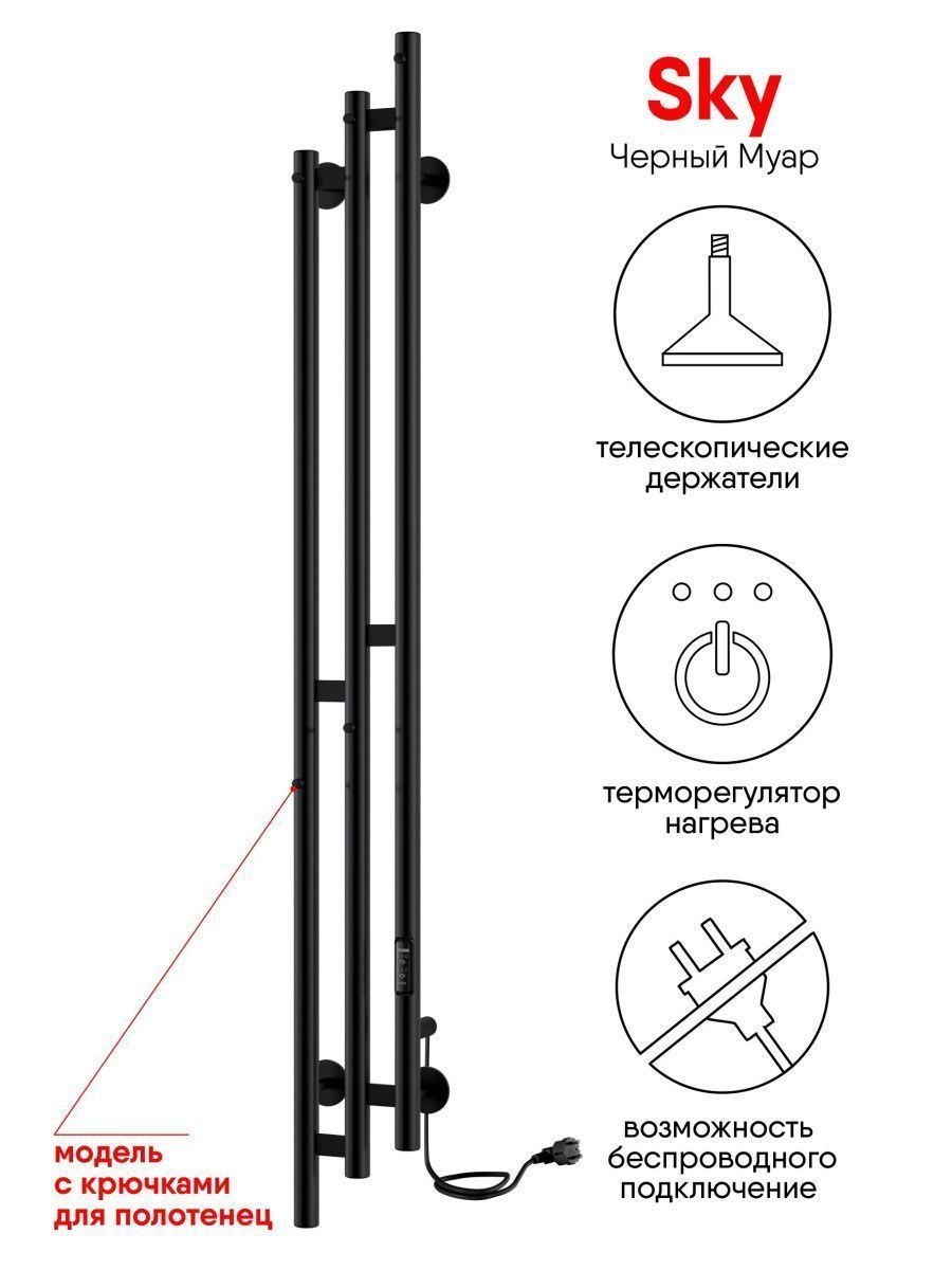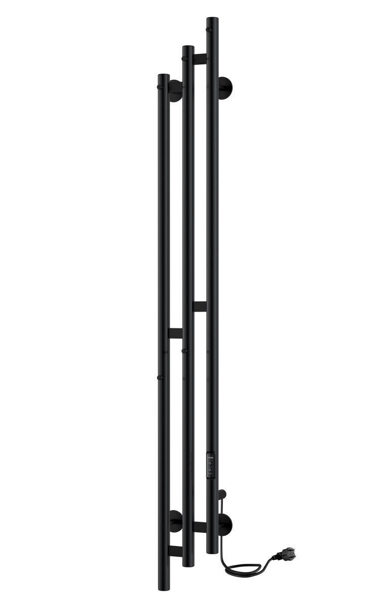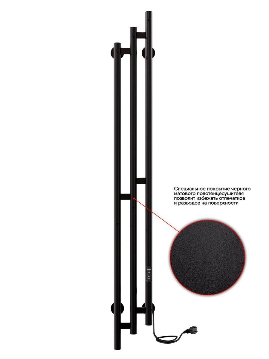 Матовое покрытие с легкой песочной текстурой исключает следы от отпечатков пальцев, а черный цвет создаёт эффектный контраст и идеально сочетается с остальной сантехникой темных оттенков. Крючки на полотенцесушителе предусмотрены для дополнительного размещения текстильных изделий.