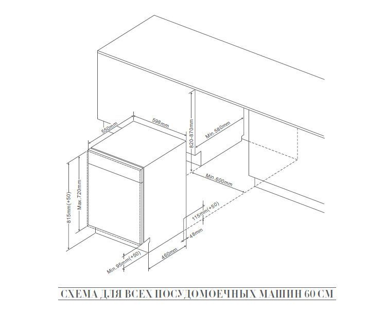 - Размеры для встраивания (ВхШхГ): 820-870x600x580 мм