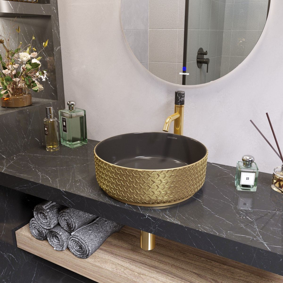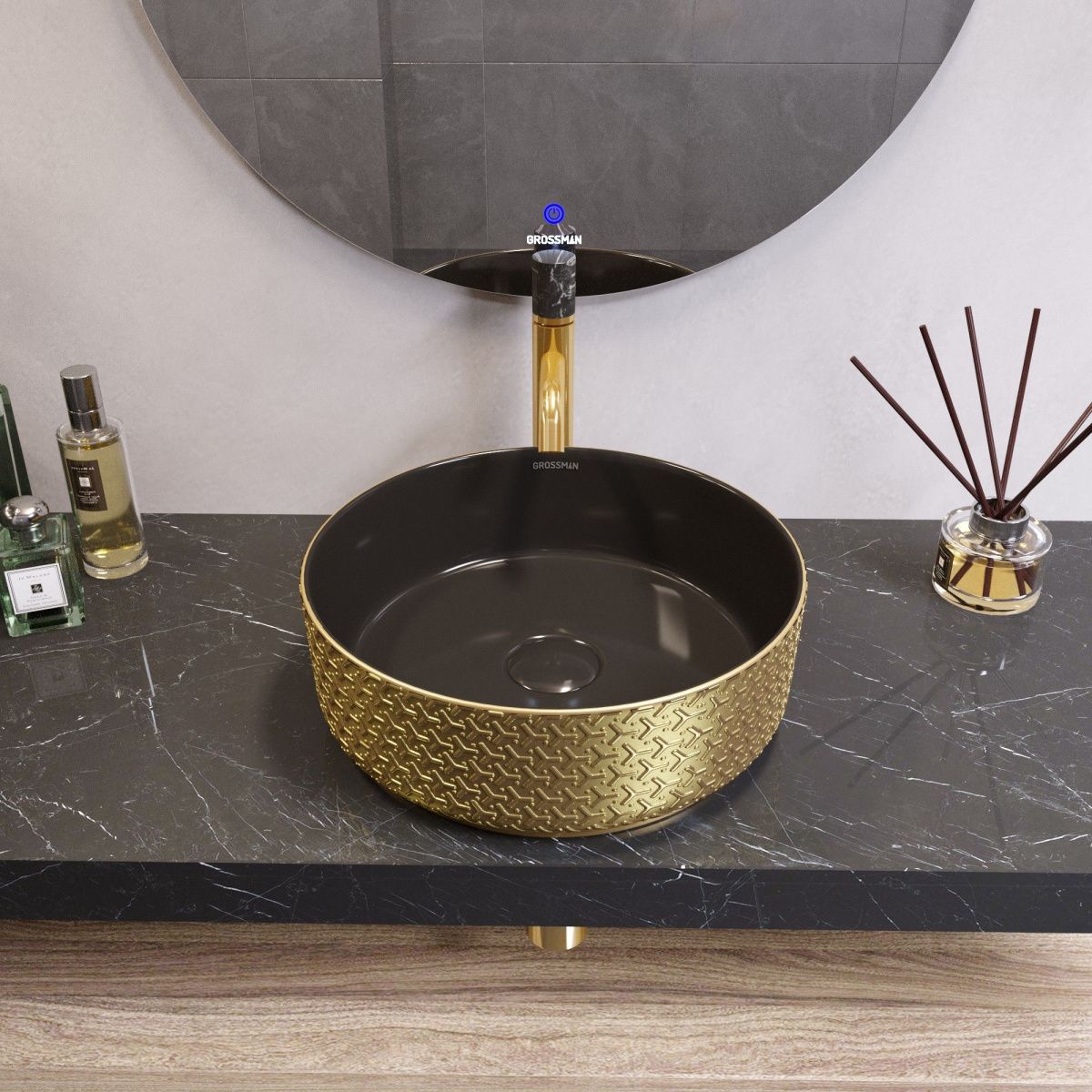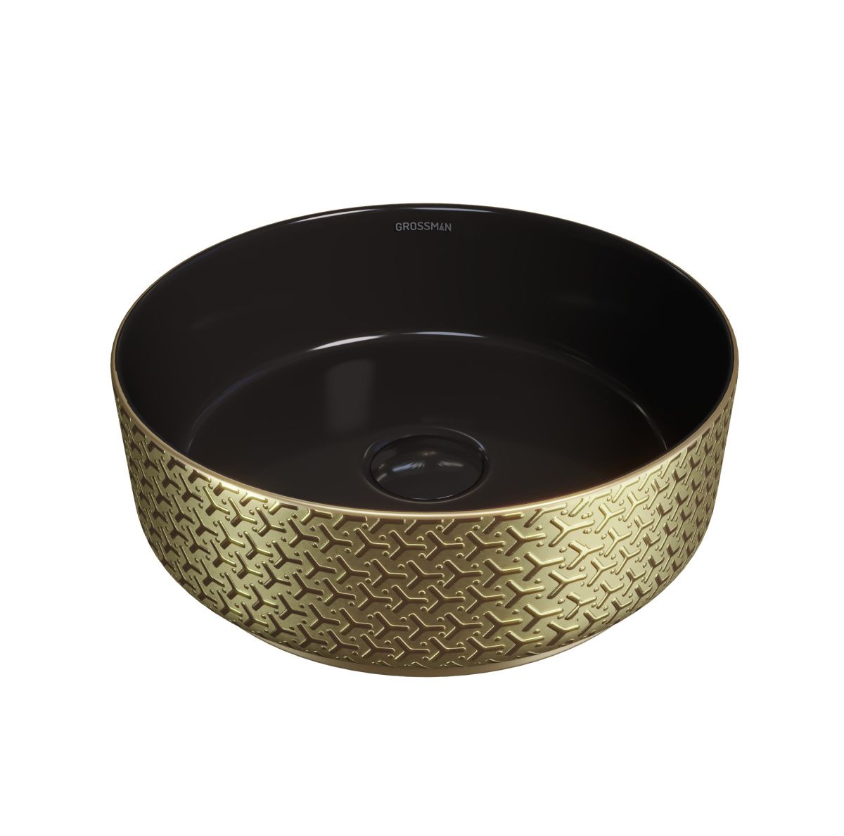 —Раковина из сантехнического фаянса Grossman Color GR-5010GBR 40х40 накладная цвет черный/золото без отверстий под смеситель