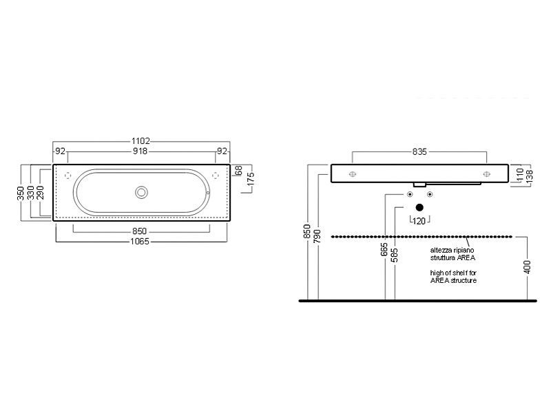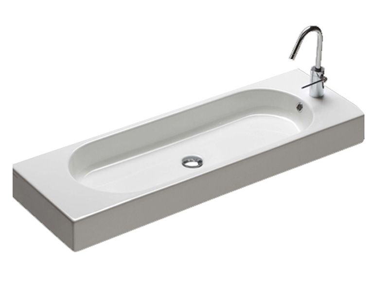 Раковина подвесная\встраиваемая в мебель HATRIA AREA Y0W501, без отверстий для смесителя, размер 110х35 см, цвет белый. Раковина с отверстием перелива; по одному отверстию для смесителя намечено справа и слева. Устанавливается на стене с помощью крепежа (приобретается отдельно), на тумбу, столешницы и подстолья. Дополнительно можно укомплектовать сифоном и донным клапаном.