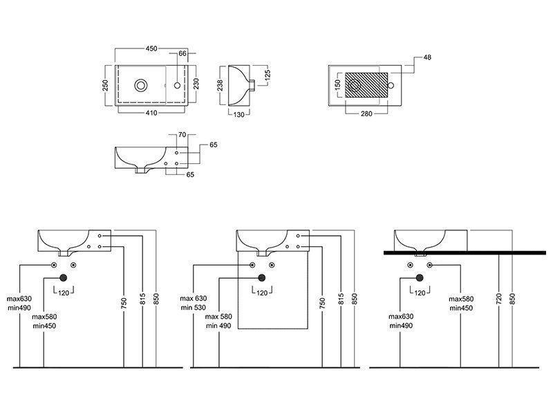 Раковина подвесная или встраиваемая в мебель HATRIA BAHIA_13 BH0450250011TS, одно отверстие для смесителя по центру справа, с отверстием перелива, размер 45х25x13 см, белая. Крепления, полотенцедержатель, структура под раковину заказывается отдельно.