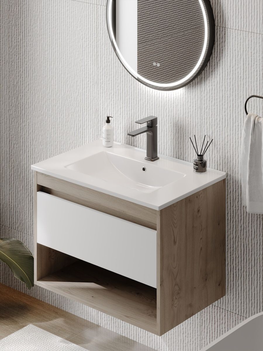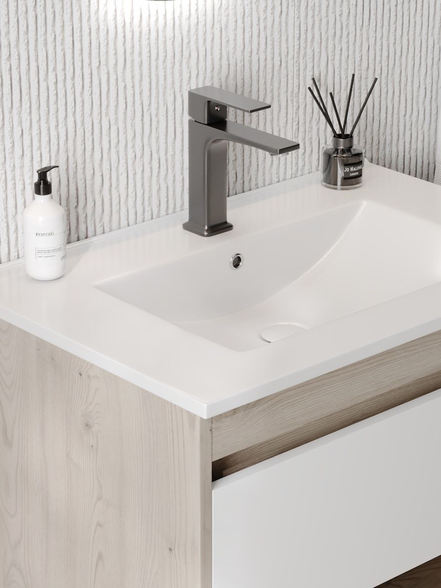 Раковина для ванной мебельная на тумбу Teymi Ritta 70 белая T51004 — современное решение для функционального и аккуратного интерьера. Прямоугольная форма размером 710×465×170 мм обеспечивает удобство размещения и подчёркивает строгие линии, придавая ванной комнате элегантный вид. Модель выполнена из качественного санфарфора, который отличается высокой прочностью и устойчивостью к износу. Глянцевая поверхность придаёт светлый, опрятный вид, проста в уходе и устойчива к влаге. Классический белый цвет универсален и подходит для любых стилевых решений, визуально расширяя пространство и сохраняя ощущение чистоты. Полочка под смеситель и предусмотренное отверстие делают установку сантехники простой и удобной. Это позволяет подобрать подходящий смеситель под стиль интерьера. Отверстие под перелив диаметром 35 мм защищает от случайного переполнения, обеспечивая дополнительную безопасность при использовании. Чаша размером 470×270×105 мм спроектирована для комфортного применения, снижая риск разбрызгивания воды и упрощая ежедневные процедуры. Практичные боковые крылья шириной по 120 мм с обеих сторон создают дополнительное пространство для размещения необходимых аксессуаров, таких как мыльницы, стаканы, косметика. Это помогает поддерживать порядок и организовать функциональное пространство вокруг. Teymi Ritta 70 T51004 устанавливается встроенным способом на тумбу, обеспечивая надёжное крепление и аккуратный внешний вид без лишних деталей. Современный стиль и продуманная эргономика делают модель подходящей для различных дизайнерских концепций — от минимализма до классики. Бренд Teymi уделяет особое внимание качеству продукции и её удобству для пользователя. Изделие предназначено для бытового применения и сопровождается официальной гарантией сроком 10 лет, подтверждающей надёжность и долговечность конструкции. Преимущества модели: ·         Прямоугольная форма для современного интерьера; ·         Полочка с отверстием под смеситель для удобной установки; ·         Перелив для безопасного использования; ·         Глянцевая устойчивая к влаге поверхность; ·         Прочные боковые крылья для размещения аксессуаров; ·         Классический белый цвет для универсального применения; ·         10 лет гарантии от производителя. ·           Выбирайте мебельную раковину Teymi Ritta 70 T51004 — сочетание стиля, практичности и надёжности для вашей ванной комнаты.