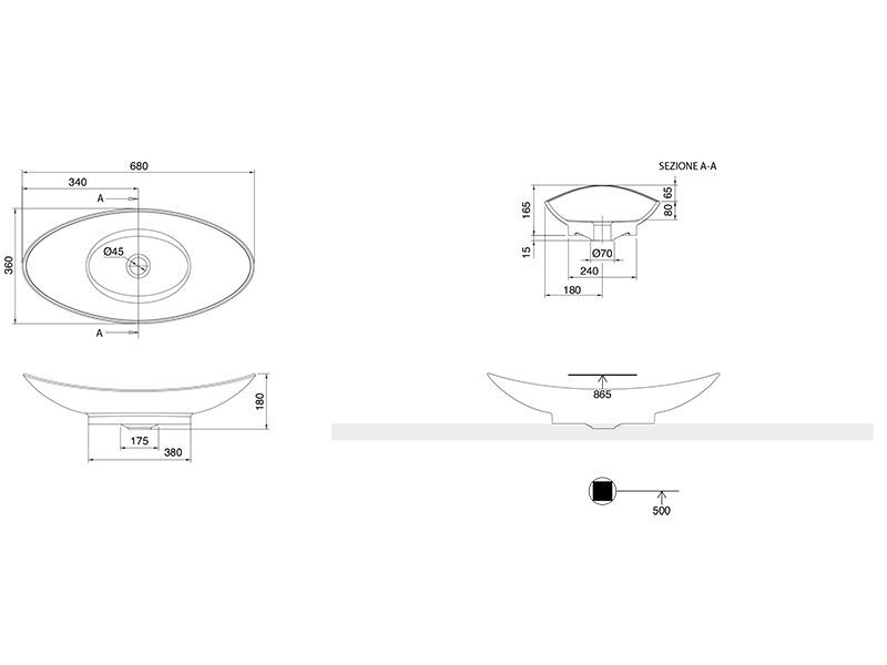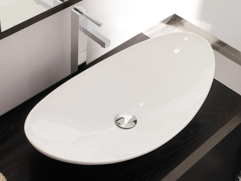 Эта овальная раковина не имеет отверстия под смеситель и перелива, что делает ее еще более современной и необычной. Ее размеры составляют 69х39х16,5 см, благодаря чему, она будет оптимальным выбором для установки на столешницу в ванной комнате.
