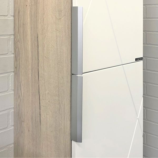 Подвесная шкаф колонна с двумя створками. Створки оснащены петлями с плавным закрыванием и серыми матовыми алюминиевыми ручками.