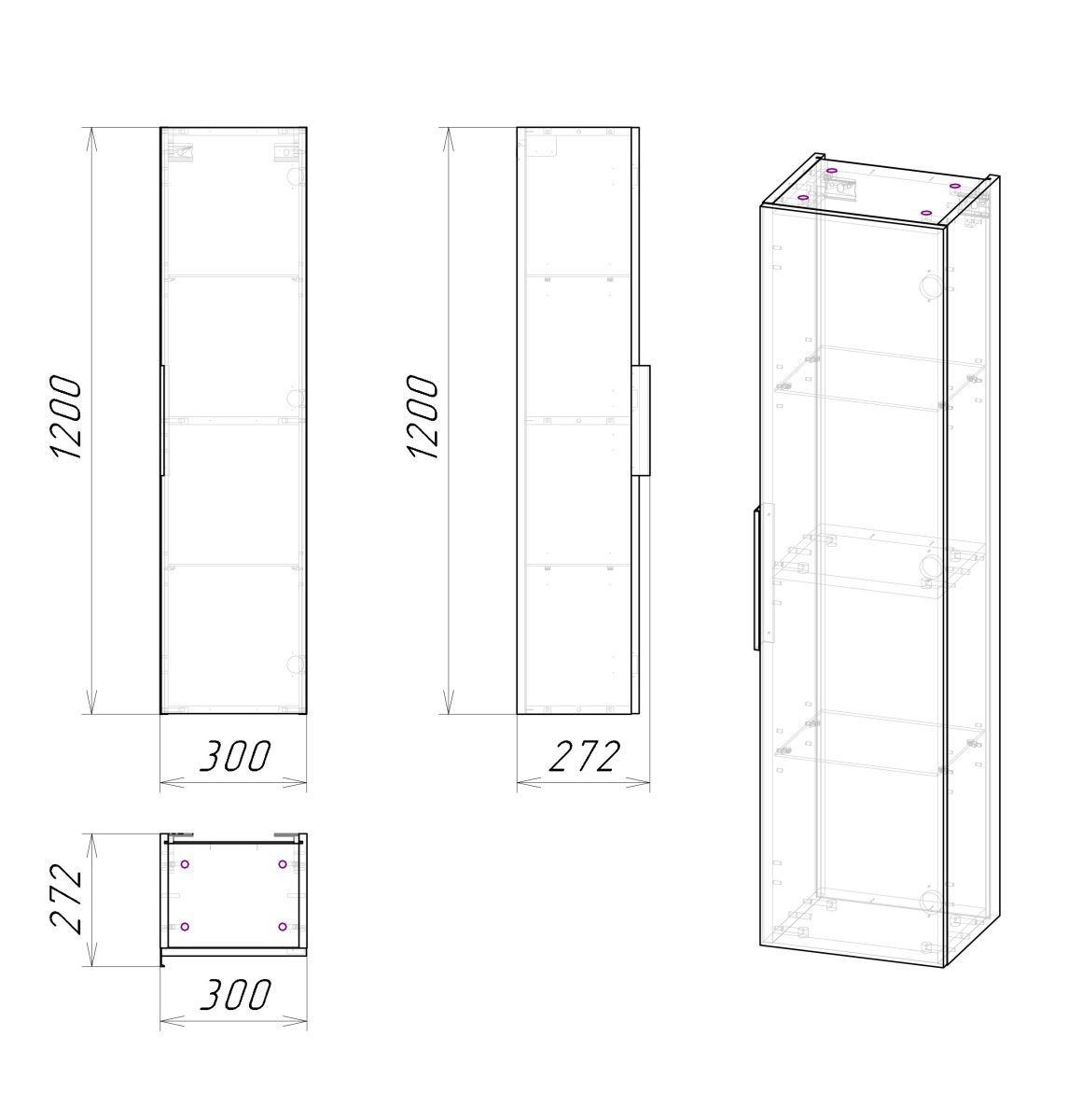 Внутреннее пространство пенала поделено полками на 4 секции. Дверь снабжена мезанихмом плавного закрывания.